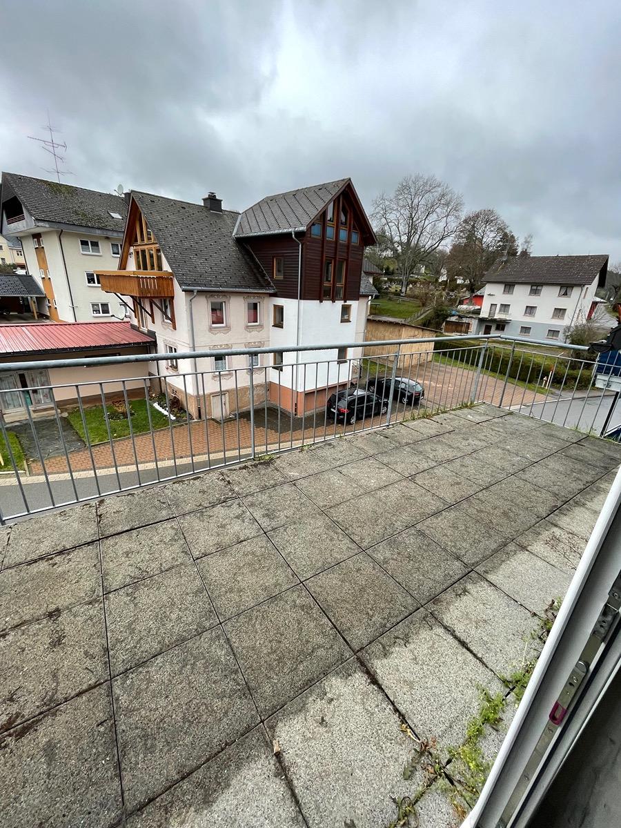 Großer, gefliester Balkon (von Küche und Wohnzimmer erreichbar) mit Aussicht ins Grüne / auf die Umgebung – ideal für entspannte Stunden im Freien.