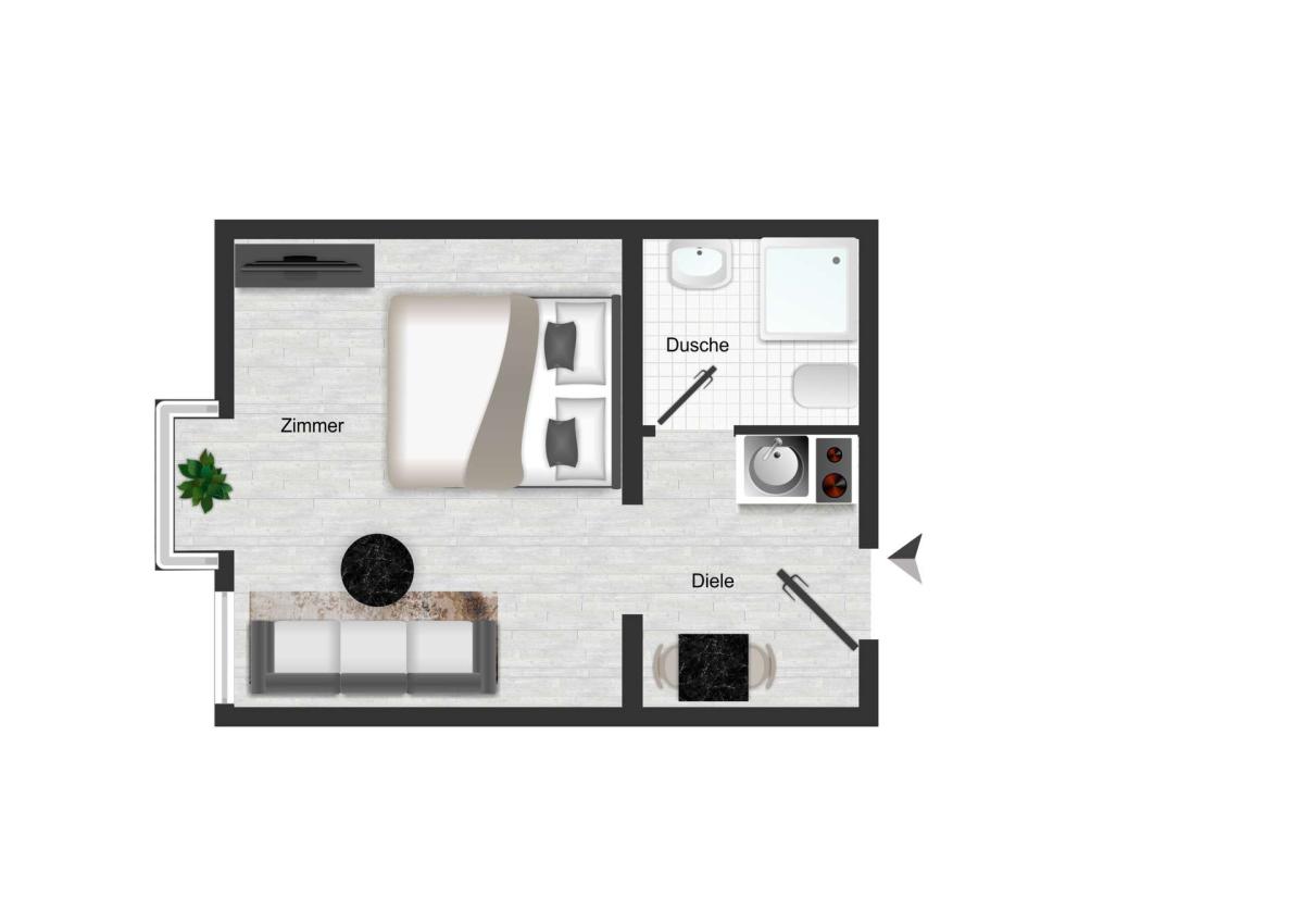 Der durchdachte, gut vermietbare Grundriss umfasst einen kombinierten Wohn- und Schlafbereich, eine funktionale Küchenzeile sowie ein Badezimmer mit Dusche, Waschbecken und WC. Die kompakte Aufteilung sorgt für eine nachhaltige Nachfrage am Mietmarkt.