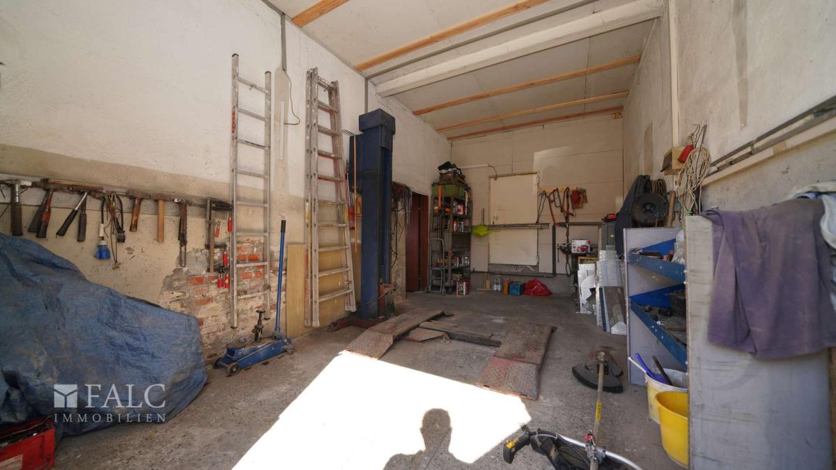 Als zusätzliches Highlight bereichert ein weiteres Gebäude das Grundstück: Im Erdgeschoss befindet sich eine große Werkstatt mit Autohebebühne, einem Büroraum und einem Lagerraum, ideal für Autofans, Tüftler, Handwerker oder alle, die viel Stauraum benötigen. Ein separater Lagerraum ergänzt das Angebot.