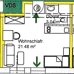 Auf ca. 25m² erwartet Sie ein möbliertes Appartement inkl. Bett, Schreibtisch, Kleiderschrank, Küchenzeile und Bad mit Dusche.