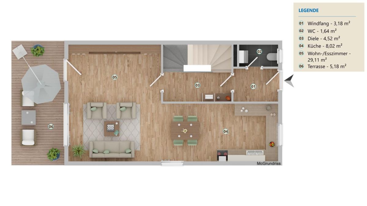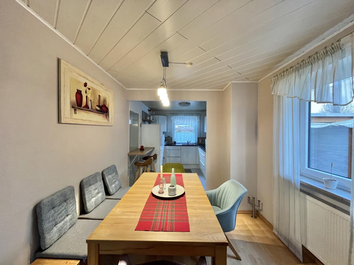 Im Erdgeschoss befinden sich die offene Küche mit moderner Einbauküche sowie der helle Wohn- und Essbereich mit direktem Zugang in den Garten. Ergänzt wird diese Ebene durch ein Gäste-WC.