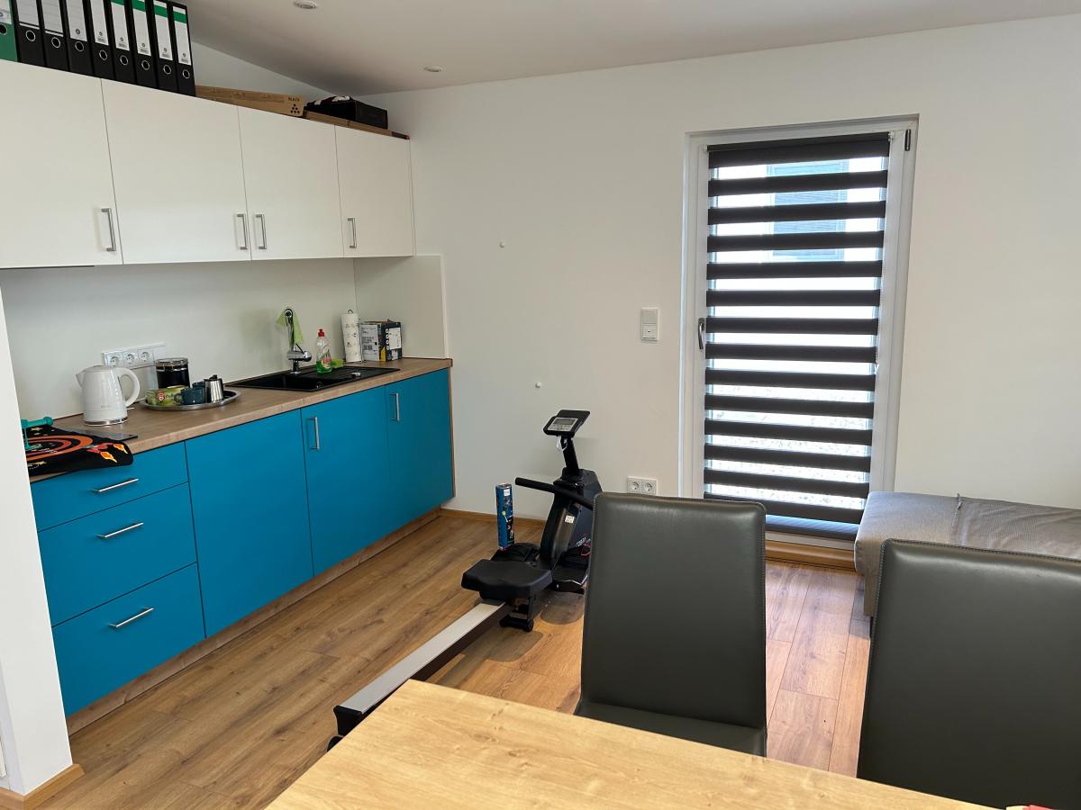 Unmittelbar mit dem Haupthaus ist das Garagen-/Technik- und "Einliegerbürogebäude" durch die Überdachung verbunden. Auf der unteren Etage erwartet Sie eine Doppelgarage mit elektr. Toren und vorgebautem Carport, Wallbox-Anschluss und der Heiz- und Technikraum. Zum Einliegerbüro (ca. 41m² Fläche) führt eine gerade Stahltreppe. Durch eine Diele gelangen Sie direkt in den hellen Büroraum, der mit einer praktischen neuwertigen Küchenzeile keine Wünsche offen lässt. Ein WC mit Duschbad und ein separater Lagerraum sorgen für weiteren Komfort. Die obere Etage ist elegant in Holzfassade gekleidet. Die Innenplissees sorgen für die nötige Verschattung des Raumes und der verlegte Vinyl in Holzoptik gilt als pflegeleicht. Von diesem Büro gelangt man auf die Dachterrasse, welche auch als Ausstellungsfläche genutzt werden kann. Weitere PKW-Stellplätze befinden sich auf dem Grundstück.