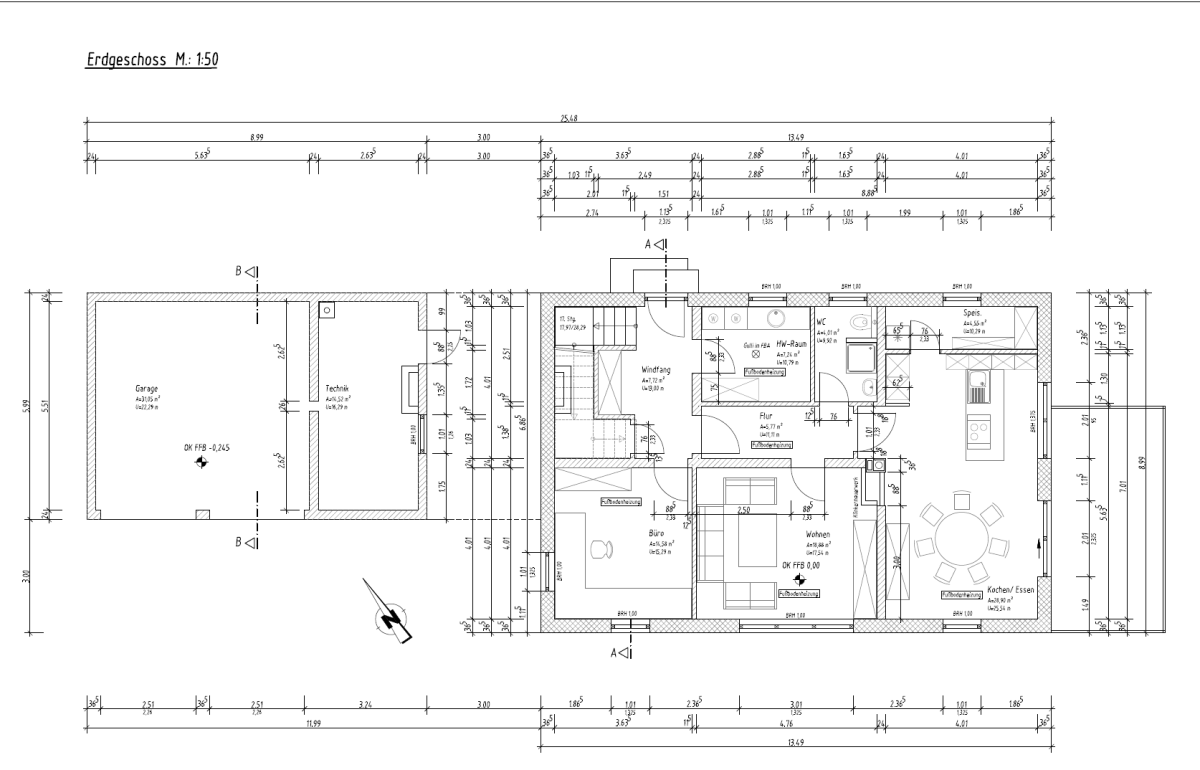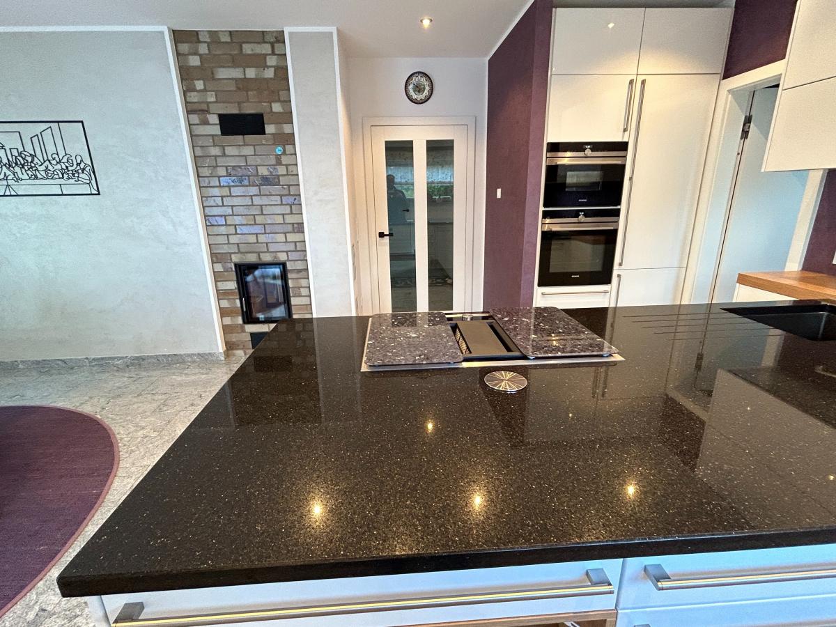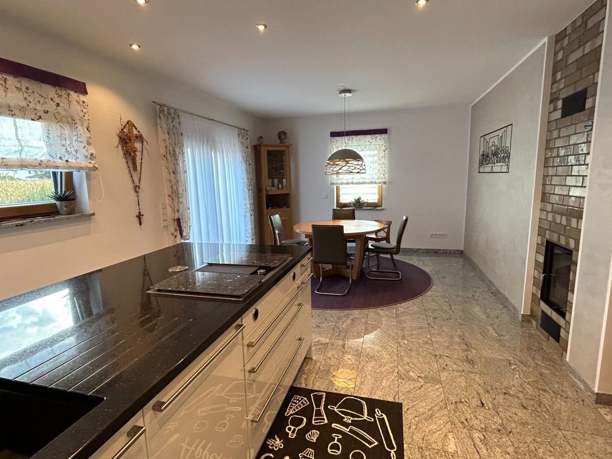 lässt sich sowohl als großzügige 2 oder 3 Zimmer Wohnung nutzen. Im Südosten des Gebäudes befindet sich die offene Küche mit Wohn-/Esszimmer mit direkten Zugang zur großen Terrasse und Gartenbereich. Der Hingucker ist hier die schöne Kücheninsel vom Hersteller Schüller (Segmüller) mit hochwertigen Siemens und Gaggenau-Geräten. Hier schließt sich bequem eine Speisekammer an. Neben der Fußbodenheizung, die über Erdgas befeuert wird, sorgt der Tunnelkamin von der Firma Brunner in den kälteren Jahreszeiten für zusätzliches warmes Wohlbefinden. Das zum Tunnelkamin angrenzende Wohn- (oder Schlafzimmer), ein weiteres Schlafzimmer, ein Duschbad, kl. Abstellraum, Garderobe und der Hauswirtschaftsraum (mit Wirtschaftszeile) befinden sich im Erdgeschoss. Das Obergeschoss hat eine Raumhöhe von ca. 2,60 m und teilt sich auf in fünf Räume bzw. möglichen Büros und einem schönen Bad mit Wanne, Dusche, WC und Doppelwaschbecken sowie einem weiteren hochwertigen Bad mit Wanne und WC. In den Dielen und Bädern und im Wohn-/Essbereich wurde als Bodenbelag Granit (Viscont White) verlegt. Im Wohnzimmer liegt ein Fischgrätenparkett aus Eiche und in den Räumen im Obergeschoss Eichenparkett. Dreifachverglaste Fenster (innen Lärche und außen Aluschale), elektrische Rollos im gesamten Haus, Spots in Diele, Küche, Esszimmer, Bad und Dusche, sowie weiße, hohe Türen (2,11 m) werten diese Immobilie auf.
