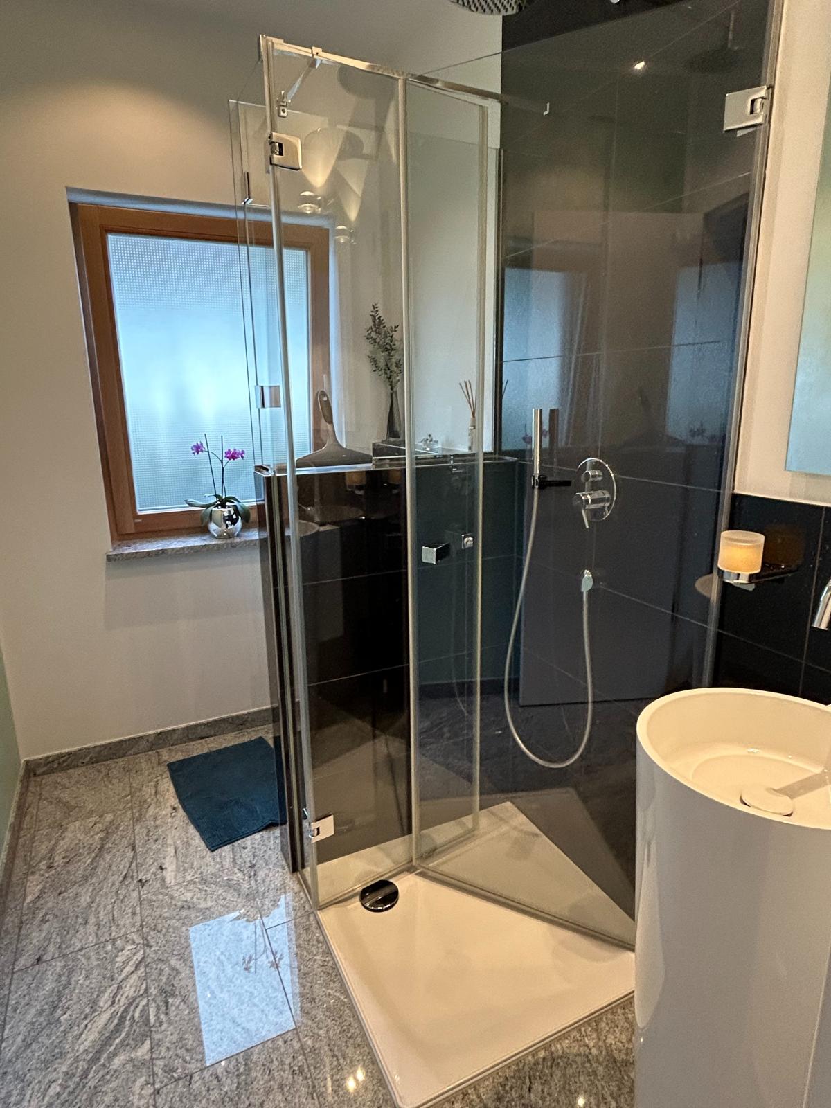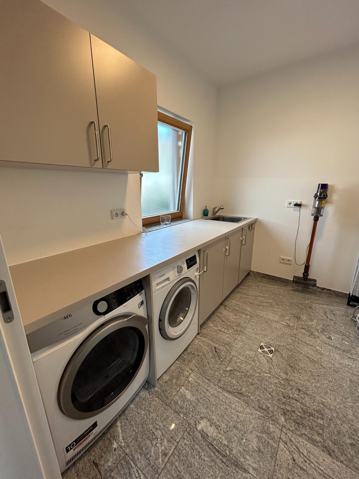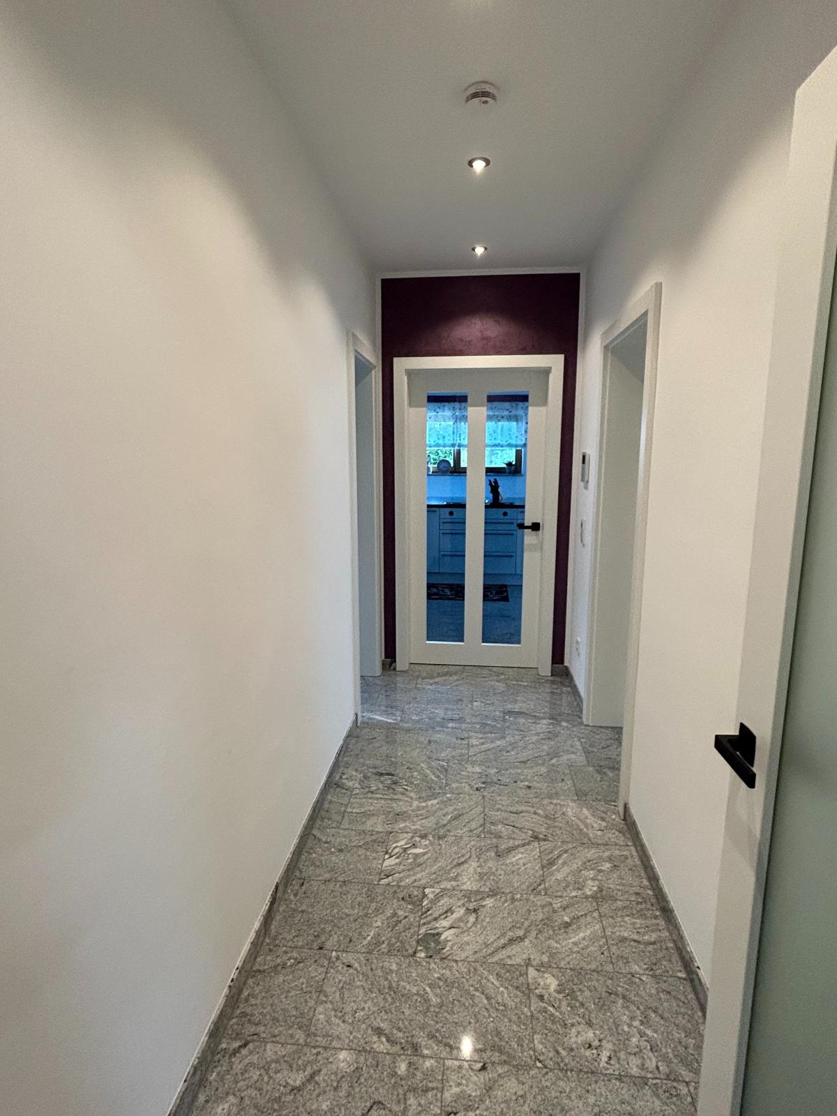 lässt sich sowohl als großzügige 2 oder 3 Zimmer Wohnung nutzen. Im Südosten des Gebäudes befindet sich die offene Küche mit Wohn-/Esszimmer mit direkten Zugang zur großen Terrasse und Gartenbereich. Der Hingucker ist hier die schöne Kücheninsel vom Hersteller Schüller (Segmüller) mit hochwertigen Siemens und Gaggenau-Geräten. Hier schließt sich bequem eine Speisekammer an. Neben der Fußbodenheizung, die über Erdgas befeuert wird, sorgt der Tunnelkamin von der Firma Brunner in den kälteren Jahreszeiten für zusätzliches warmes Wohlbefinden. Das zum Tunnelkamin angrenzende Wohn- (oder Schlafzimmer), ein weiteres Schlafzimmer, ein Duschbad, kl. Abstellraum, Garderobe und der Hauswirtschaftsraum (mit Wirtschaftszeile) befinden sich im Erdgeschoss. Das Obergeschoss hat eine Raumhöhe von ca. 2,60 m und teilt sich auf in fünf Räume bzw. möglichen Büros und einem schönen Bad mit Wanne, Dusche, WC und Doppelwaschbecken sowie einem weiteren hochwertigen Bad mit Wanne und WC. In den Dielen und Bädern und im Wohn-/Essbereich wurde als Bodenbelag Granit (Viscont White) verlegt. Im Wohnzimmer liegt ein Fischgrätenparkett aus Eiche und in den Räumen im Obergeschoss Eichenparkett. Dreifachverglaste Fenster (innen Lärche und außen Aluschale), elektrische Rollos im gesamten Haus, Spots in Diele, Küche, Esszimmer, Bad und Dusche, sowie weiße, hohe Türen (2,11 m) werten diese Immobilie auf.