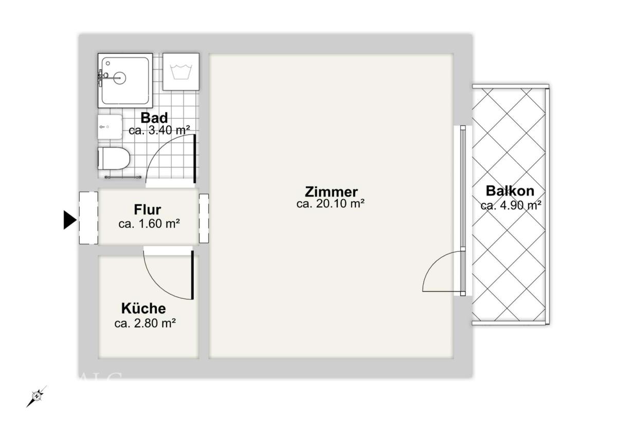 Sehr bequem mit dem Aufzug erreicht man diese kompakte Single-Wohnung mit ihren 30qm am Gangende im 4. Stock.