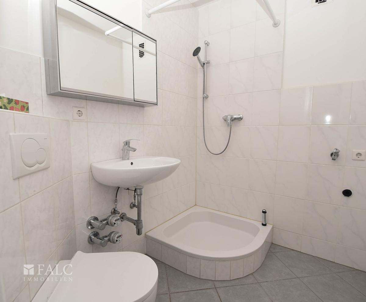 Zurück im Flur schließen sich rechts und links eine Einbauküche mit Kühlschrank an und auf der anderen Seite das erst vor ein paar Jahren renovierte Badezimmer mit einer Dusche. Hier ist auch Platz genug zum Aufstellen einer Waschmaschine. Im Flur bietet ein kleiner Einbauschrank über der Tür Stauraum an.