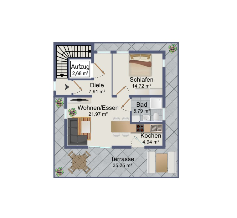 Neben der modernen und sehr gut durchdachten Raumaufteilung, verfügt jede der Wohnungen über einen nach Süd-Ost ausgerichteten Balkon/Terrasse bzw. im Staffelgeschoss über eine umlaufende Terrasse.