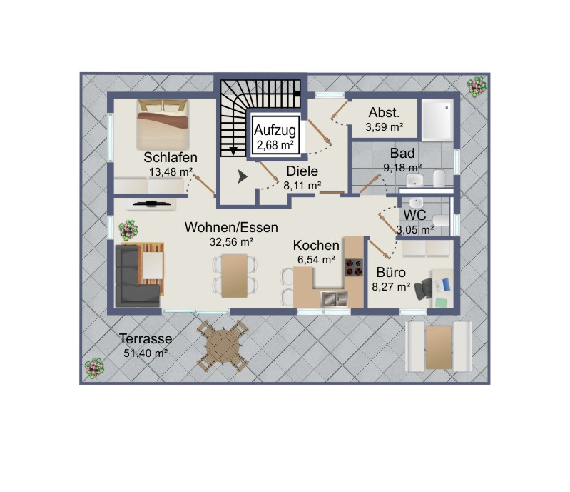 Neben der modernen und sehr gut durchdachten Raumaufteilung, verfügt jede der Wohnungen über einen nach Süd-Ost ausgerichteten Balkon/Terrasse bzw. im Staffelgeschoss über eine umlaufende Terrasse.