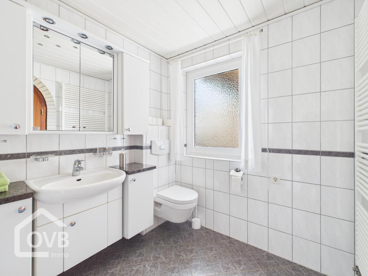 Das Badezimmer wurde 2002 seniorengerecht modernisiert. Es präsentiert sich hell und funktional mit bodengleicher Dusche, wandhängendem WC, Handtuchheizkörper sowie Platz für Waschmaschine und Trockner.