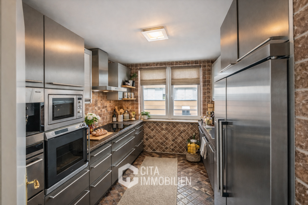 Der lichtdurchflutete Wohnbereich beeindruckt mit bodentiefen Fenstern, die sich über die gesamte Terrassenseite erstrecken – und so einen fließenden Übergang zwischen Innen- und Außenraum schaffen. Die angrenzende Küche fügt sich harmonisch in das offene Wohnkonzept ein und bietet ausreichend Platz für individuelle Gestaltung.