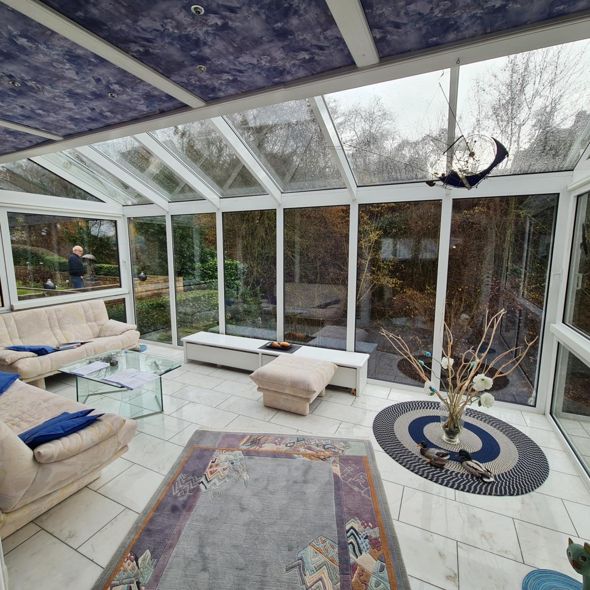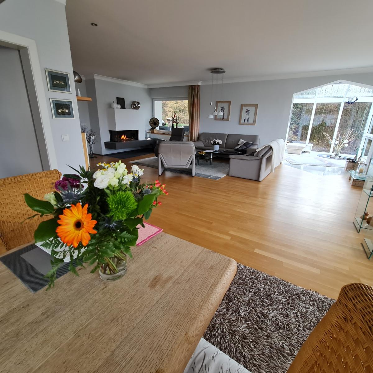 Der einladende Wohn- und Essbereich mit gemütlichem Kamin bildet das Herzstück des Hauses - ideal für gesellige Abende und entspannte Stunden. Von hier aus gelangen Sie in den sonnendurchfluteten Wintergarten sowie auf die weitläufigen Terrassen, die zu gemütlichen Grillabenden oder zum Sonnen einladen.