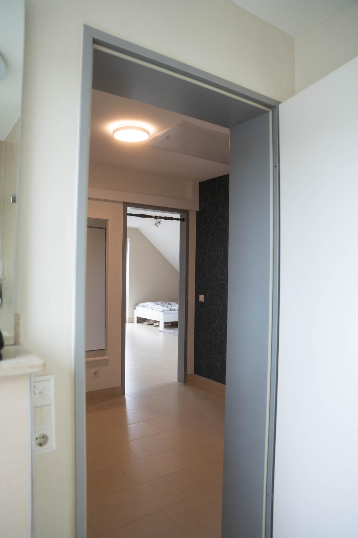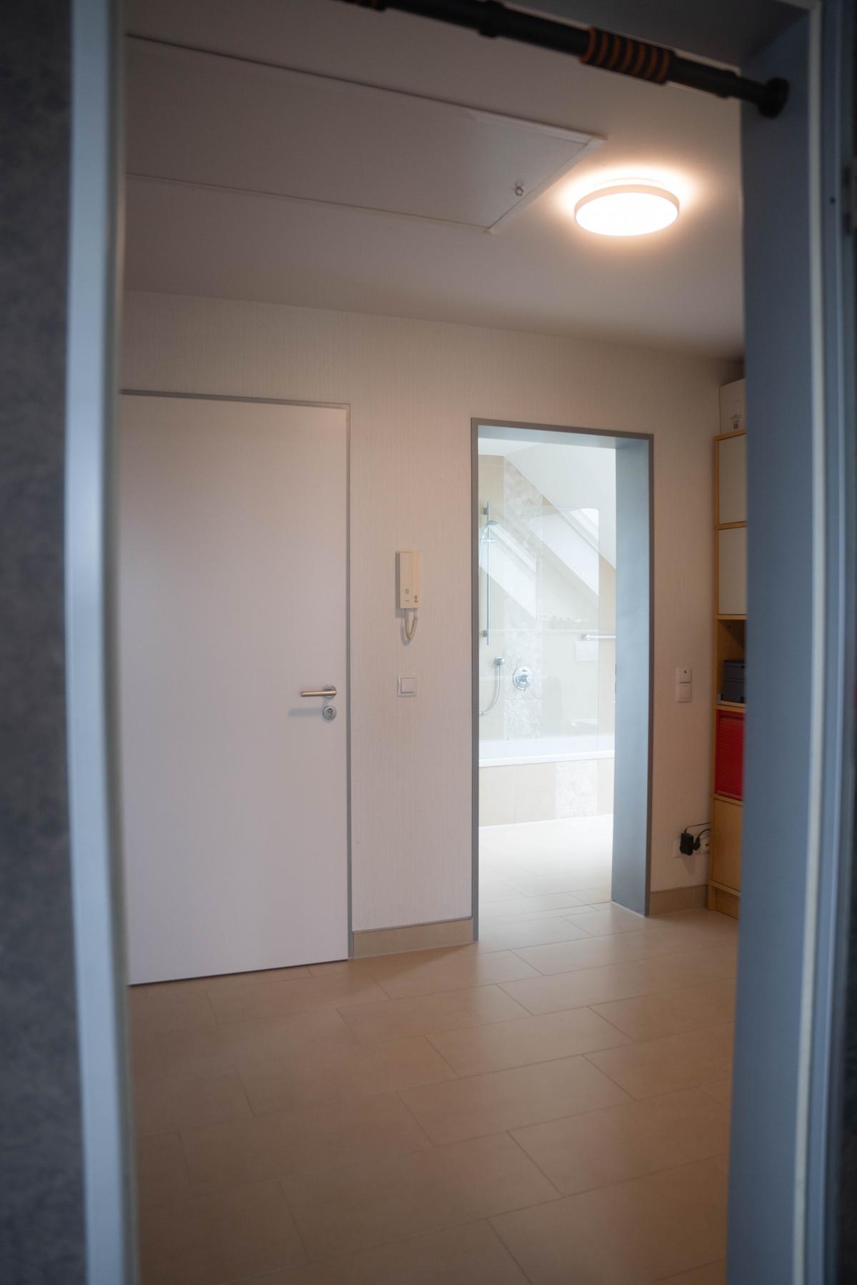 Aus dem großzügigen Treppenhaus treten Sie in die kompakte Diele der Wohnung. Von hier aus erreichen Sie das Badezimmer, das Schlafzimmer, sowie das geräumige Wohnzimmer mit offener Küche. Aus dem Wohnzimmer besteht Zugangsmöglichkeit zu beiden Terrassen. Auch aus dem Schlafzimmer ist eine der Dachterrassen erreichbar.