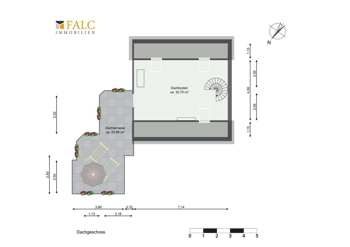 Direkt an die Dachterrasse grenzt ein Dachboden mit einer Fläche von ca. 32,20 m². Dieser Bereich eignet sich beispielsweise als Arbeitsbereich, Hobbyraum oder zusätzliche Abstellfläche.