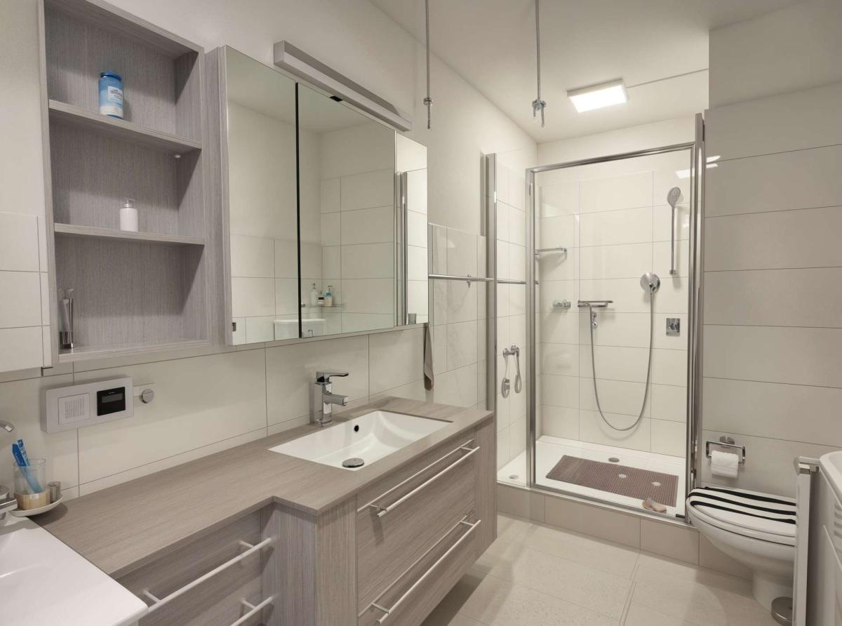 Modernes Duschbad: Zeitlos und funktional mit Waschmaschinenanschluss.