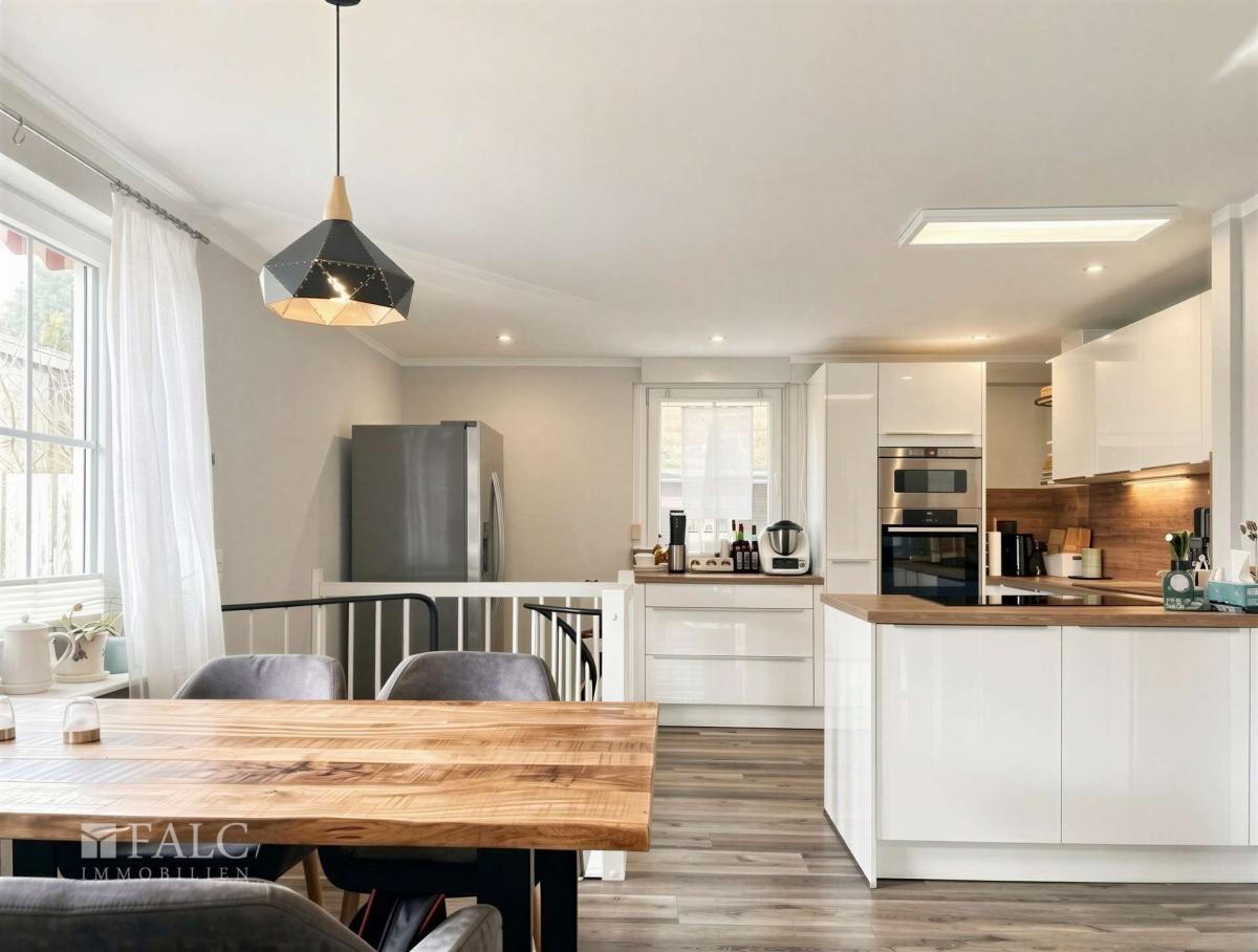 Die voll ausgestattete Einbauküche bietet sämtliche notwendigen Elektrogeräte und ausreichend Arbeits- sowie Stauraum, wodurch sie sowohl für den Alltag als auch für gesellige Kochabende bestens geeignet ist. Im Erdgeschoss sorgt ein stilvoller Kaminofen für ein behagliches Ambiente und angenehme Wärme, insbesondere in der kälteren Jahreszeit. Für eine effiziente und moderne Wärmeversorgung wurde 2021 eine neue Brennwerttherme installiert. Ergänzend befindet sich im Garten ein Flüssiggastank, der die zuverlässige Energieversorgung des Hauses sicherstellt.