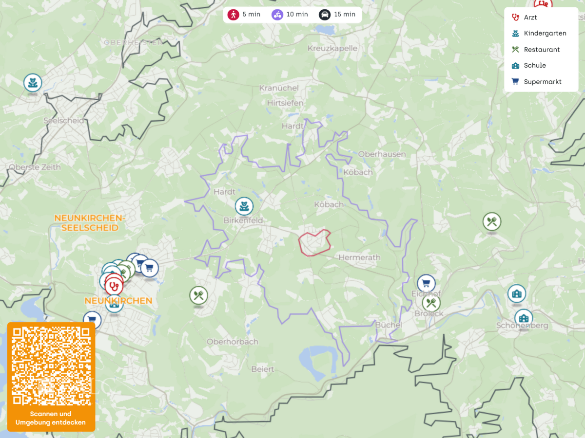 Die Betreuungssituation ist komfortabel: Ein Familienzentrum mit Tageseinrichtung für Kinder Seelkirchen befindet sich in ca. 1 km Entfernung. Weitere Einrichtungen wie die Kindertagesstätte Sankt Margareta und der Aktion Kindergarten liegen jeweils in ca. 4 km. Auch die schulische Versorgung ist gut abgedeckt, mit der Ritter Göttscheid Grundschule in ca. 4 km sowie der Gesamtschule Neunkirchen in ca. 4 km.