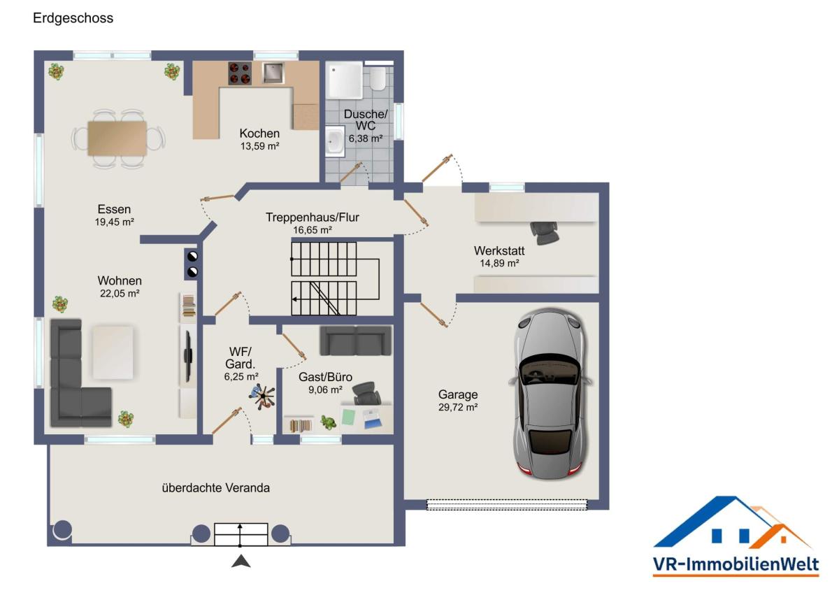 Bereits von außen besticht das Objekt durch seine ansprechende Architektur und eine Veranda im amerikanischen Stil, die dem Haus besonderen Charme verleiht.