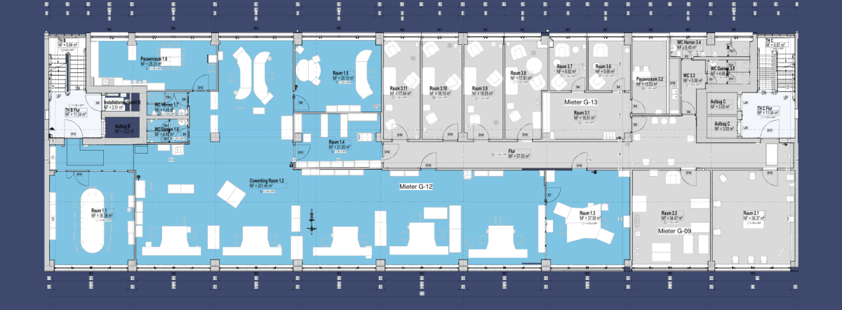 Effiziente Bürofläche im 3. Obergeschoss mit offener Grundstruktur und Klimatisierung. Die Einheit eignet sich für moderne Arbeitsplatzkonzepte und lässt sich gut in Teamzonen, Meetingbereiche und Rückzugsflächen gliedern.