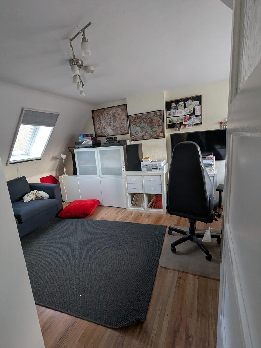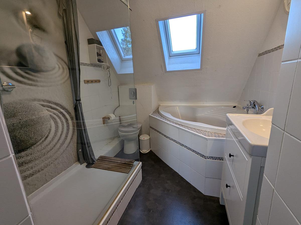 Über die Treppe gelangen Sie in 2 weitere Zimmer und ein Bad, das mit einer großzügigen Eckbadewanne ausgestattet ist.