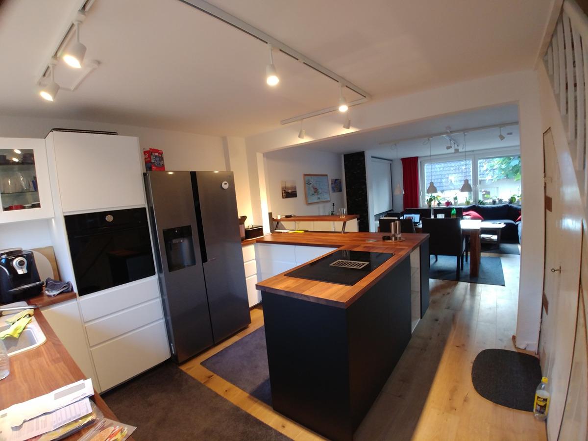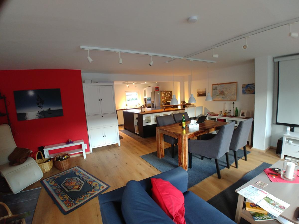 Im Erdgeschoss erwartet Sie ein heller, offener Wohn-Essbereich mit einer offenen Küche, die mit einer modernen Koch-Halbinsel ausgestattet ist – perfekt für gemeinsames Kochen und geselliges Beisammensein. Der Fußboden ist mit Eichendielen ausgestattet. Ein Kaminofen sorgt im Winter für perfekte Gemütlichkeit.