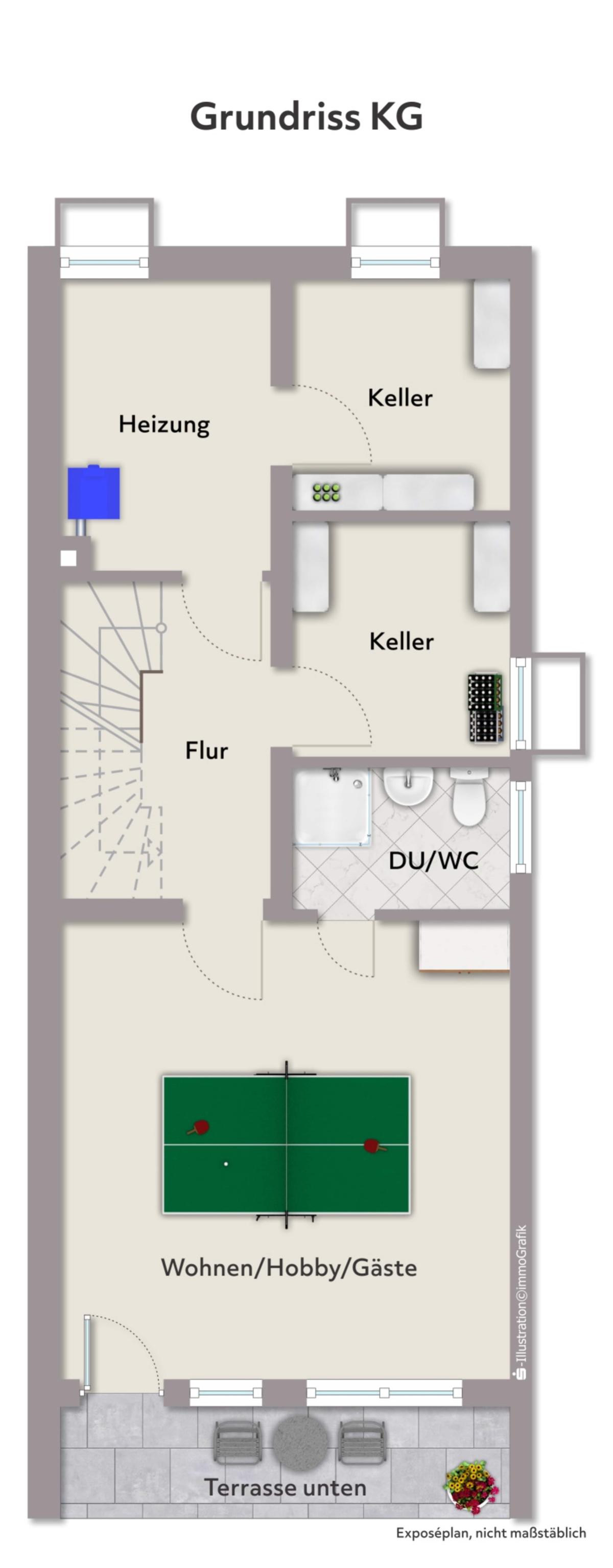 Im Sockelgeschoss befinden sich ein großer, tageslichtheller Mehrzweckraum mit Zugang zur unteren Terrasse, ein Duschbad/WC, sowie zwei Kellerräume (einer davon mit Waschbecken und Starkstromanschluss für einen möglichen Herd) und ein Heizungskeller.