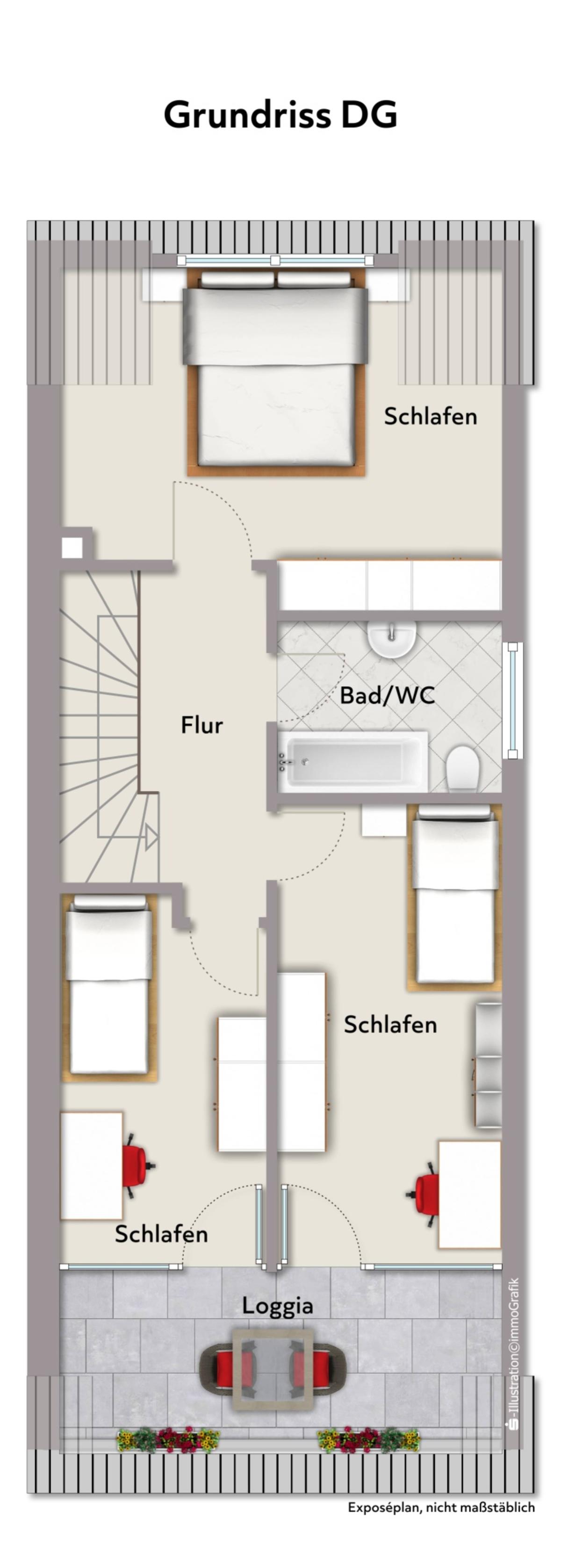 Das Dachgeschoss bietet drei Schlafzimmer und ein Tageslichtbad sowie Zugang zur Loggia im Dach.