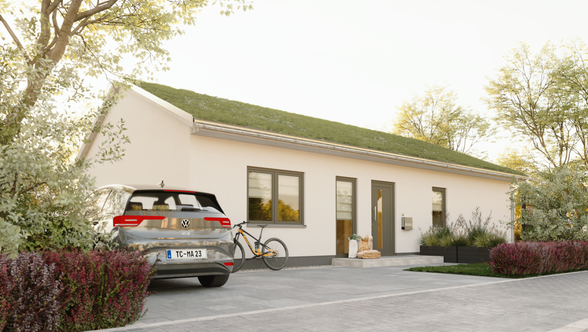 Der Bungalow mit Gründach im Neubaugebiet Helpup.