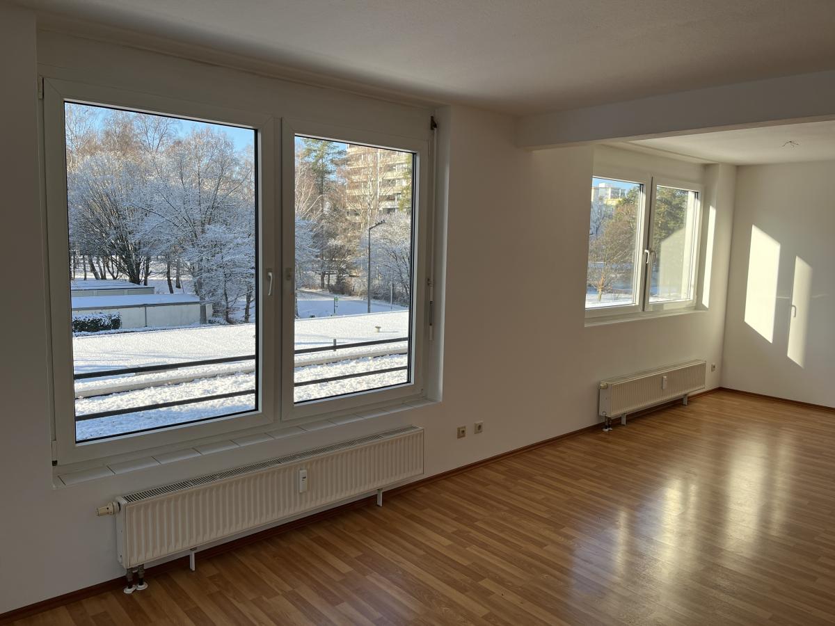 Schöne, helle Wohnräume mit Laminatboden. Wände und Decken frisch weiß gestrichen.