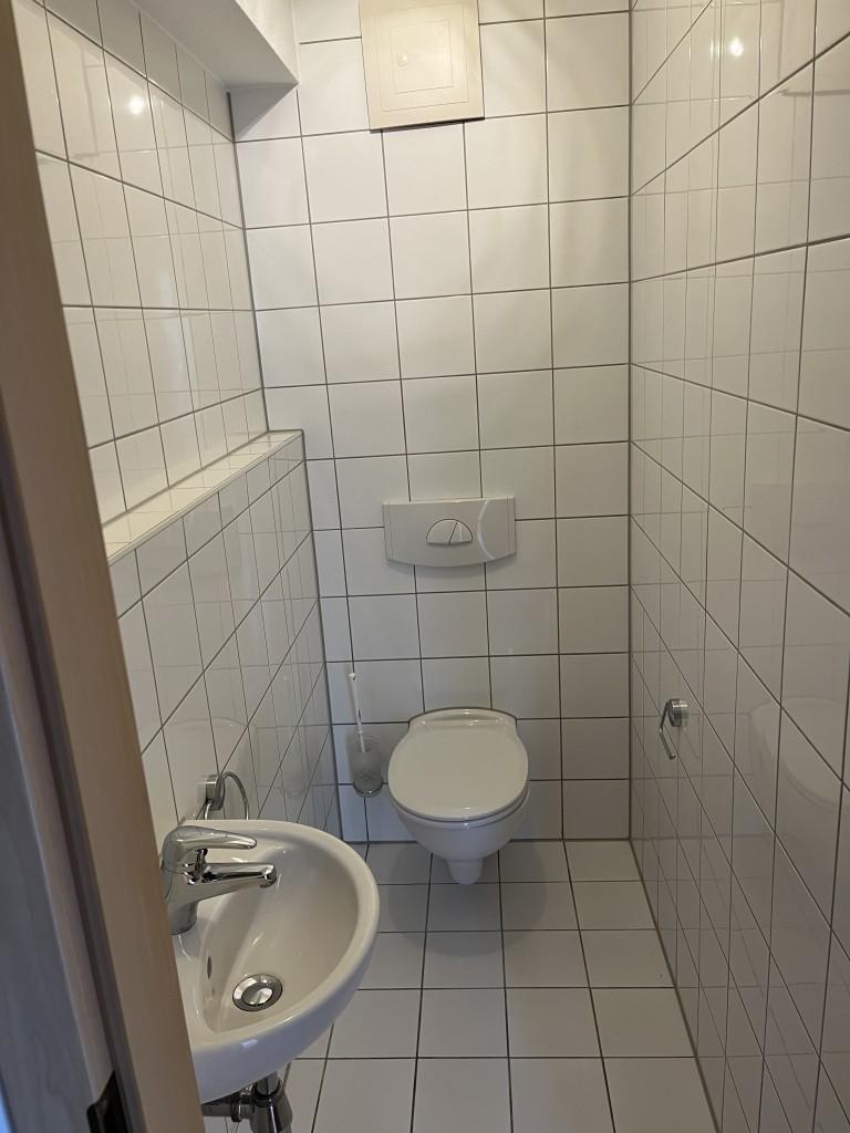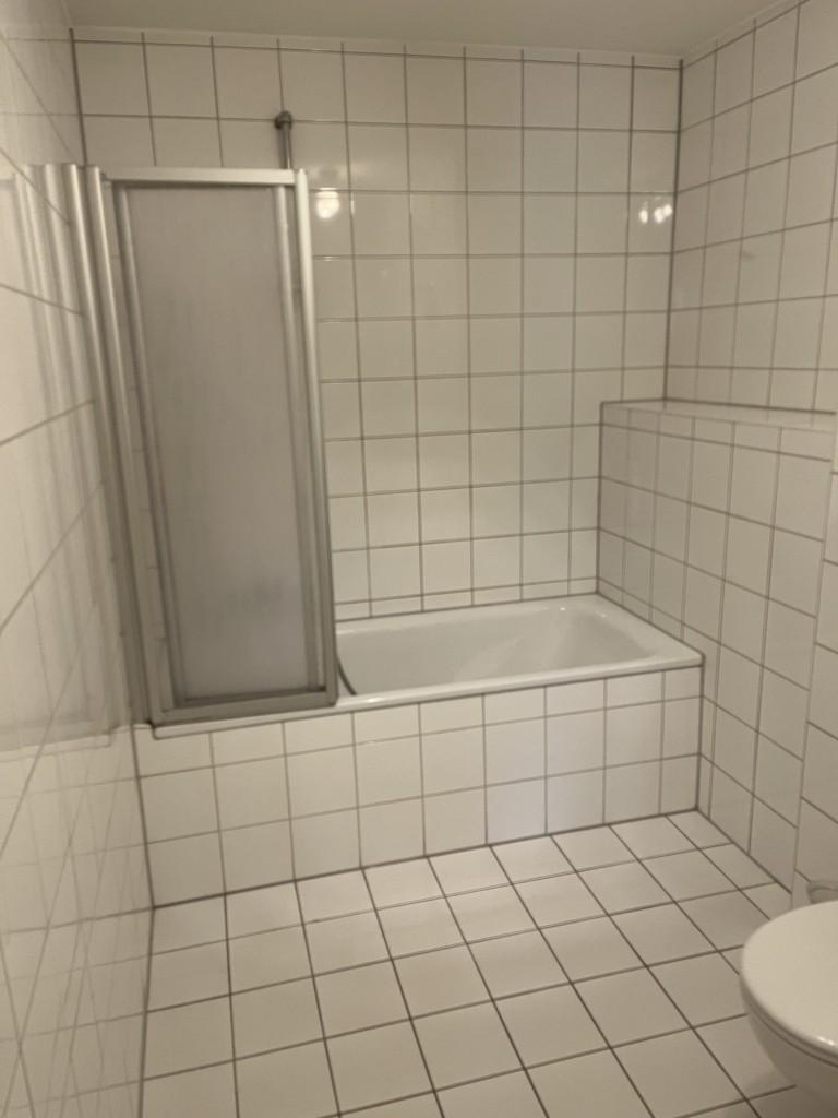 Bad mit Wanne, raumhoch, weiß gefliest, Separates WC.
