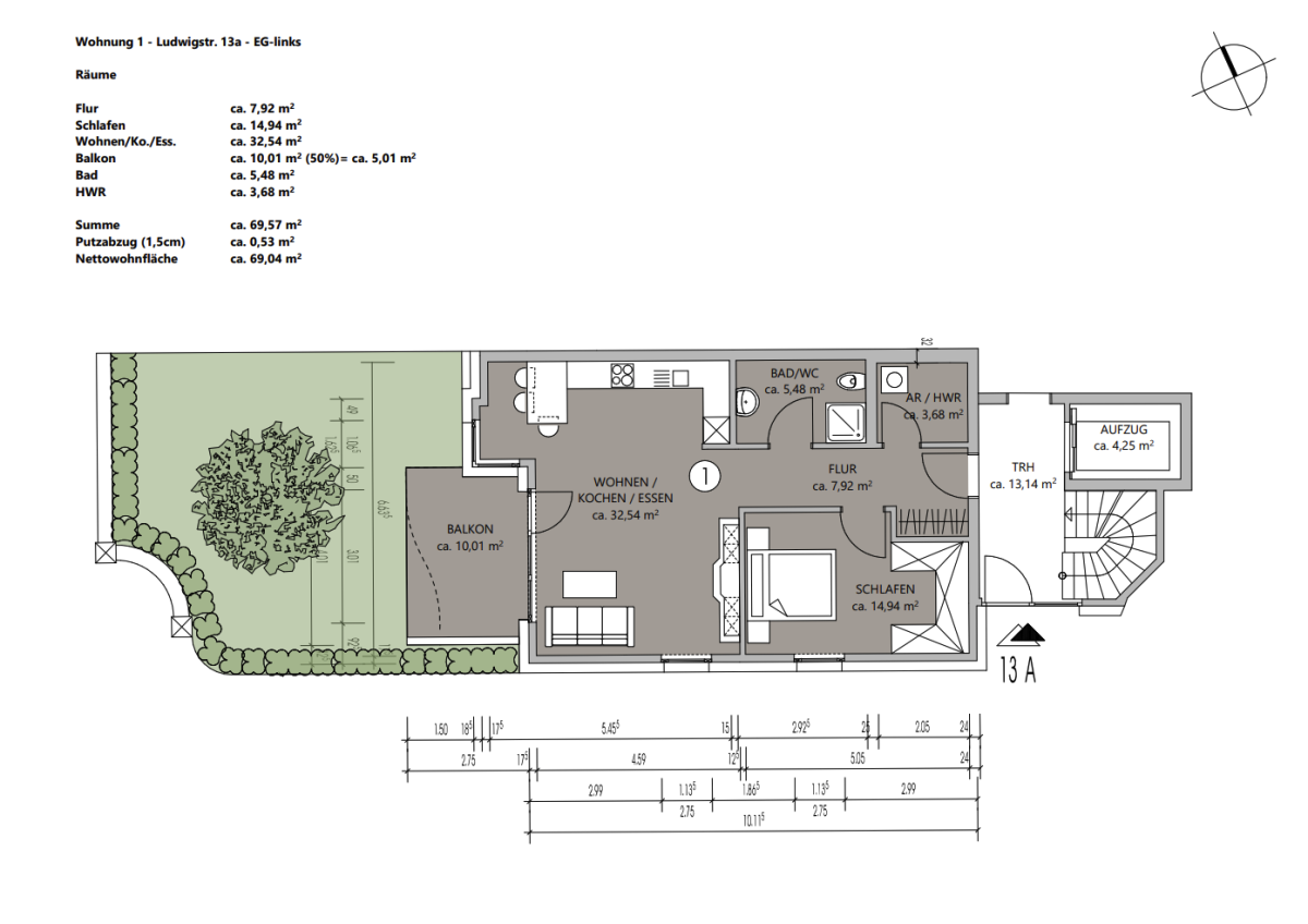 Das mittlere Gebäude (Ludwigstraße 13b) steht dem Vorderhaus in seiner Wertigkeit in nichts nach. Mit einer modernen, eleganten Gestaltung, ausgesuchten Materialien und ausgewogenen Proportionen fügt es sich harmonisch in das Ensemble ein und überzeugt durch seine klare, zeitgemäße Wohnqualität.