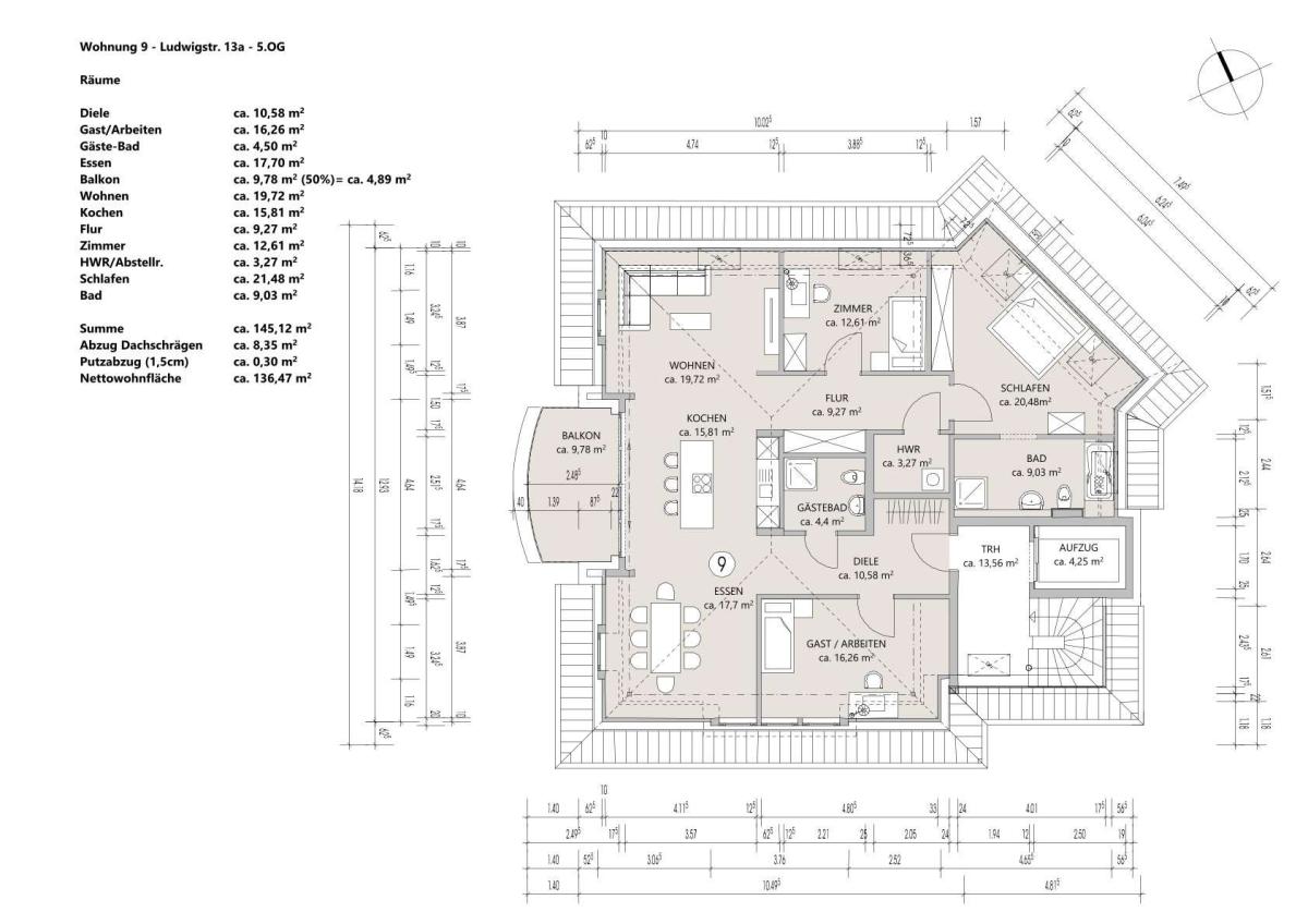 Das mittlere Gebäude (Ludwigstraße 13b) steht dem Vorderhaus in seiner Wertigkeit in nichts nach. Mit einer modernen, eleganten Gestaltung, ausgesuchten Materialien und ausgewogenen Proportionen fügt es sich harmonisch in das Ensemble ein und überzeugt durch seine klare, zeitgemäße Wohnqualität.