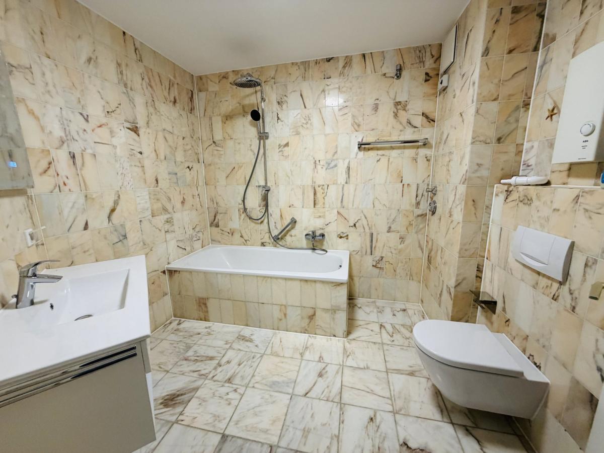 Das Badezimmer präsentiert sich modern und hochwertig gefliest und verfügt über eine komfortable Badewanne, die sich auch als Dusche nutzen lässt.