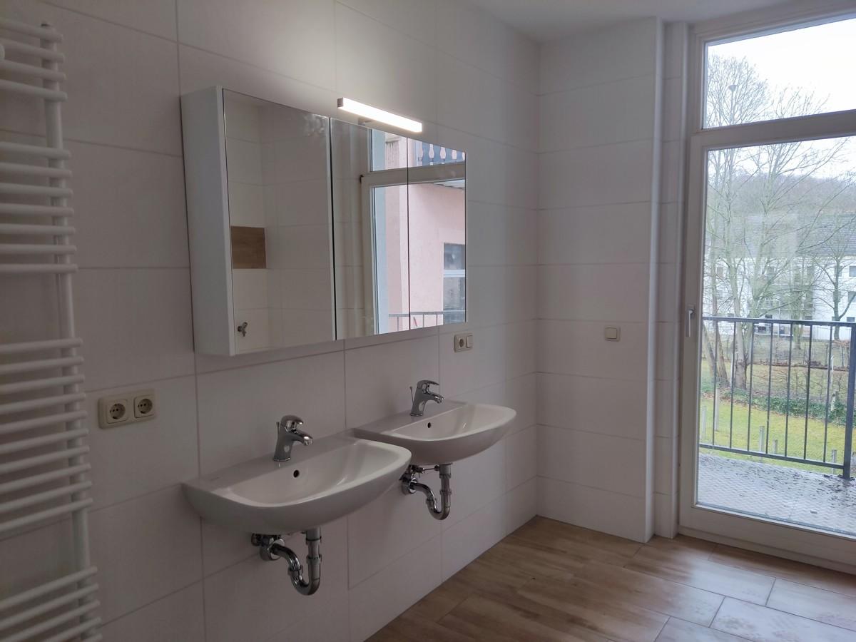 - modernes Tageslichtbad, ausgestattet mit Wanne samt Duschaufsatz, WC, zwei Waschbecken, großem Spiegelschrank und aschmaschinenanschluss