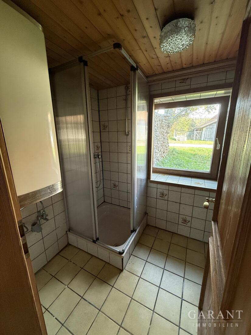 Das Wohnhaus ist im Erd- und Obergeschoss ausgebaut mit Wohnküche, Wohnstube, einem kleinen Bad aus den 80ern und diversen Schlafzimmern. Der klassische Kachelofen fehlt natürlich nicht, wie auch der Holz-Kochherd in der Küche.