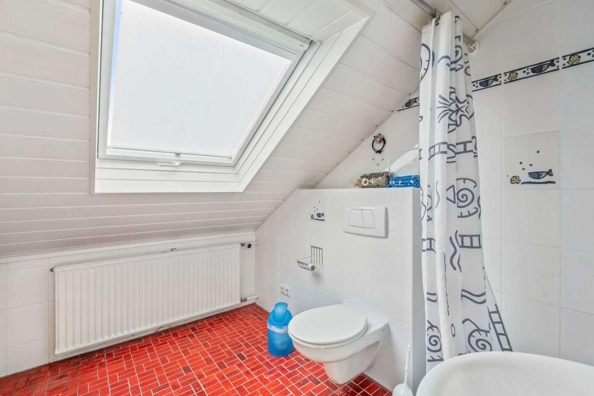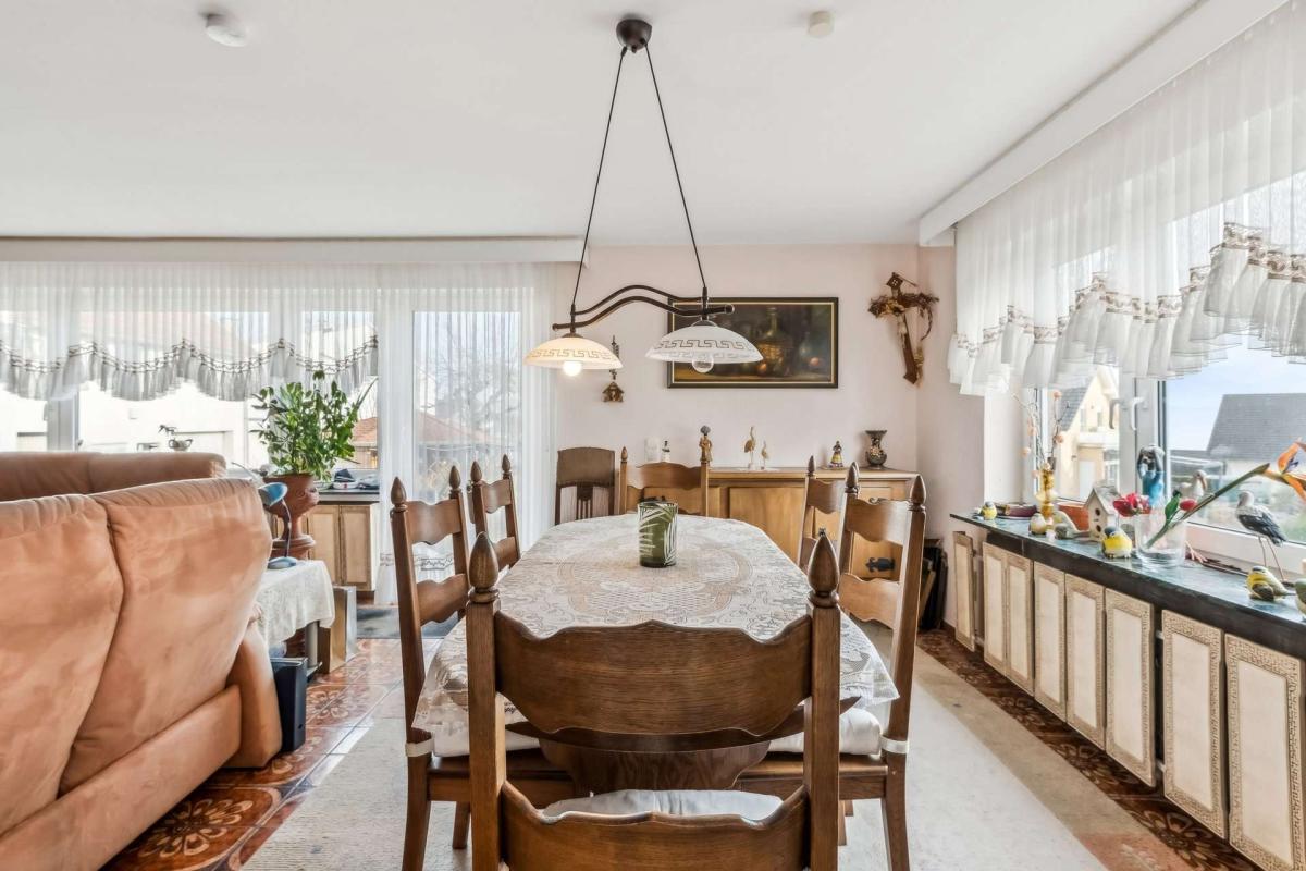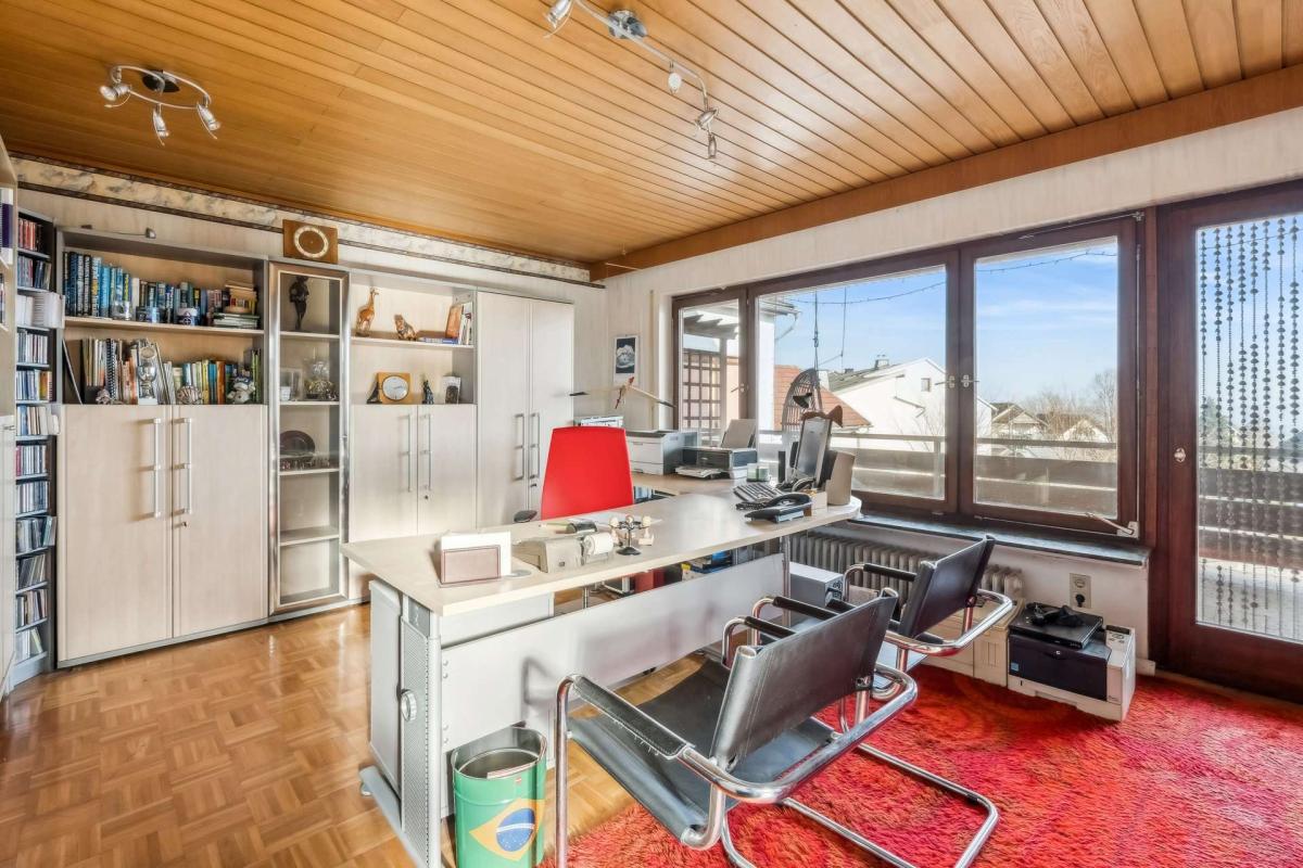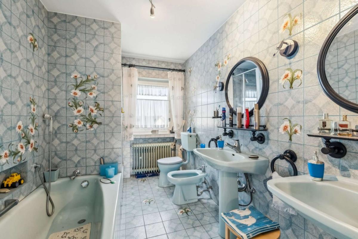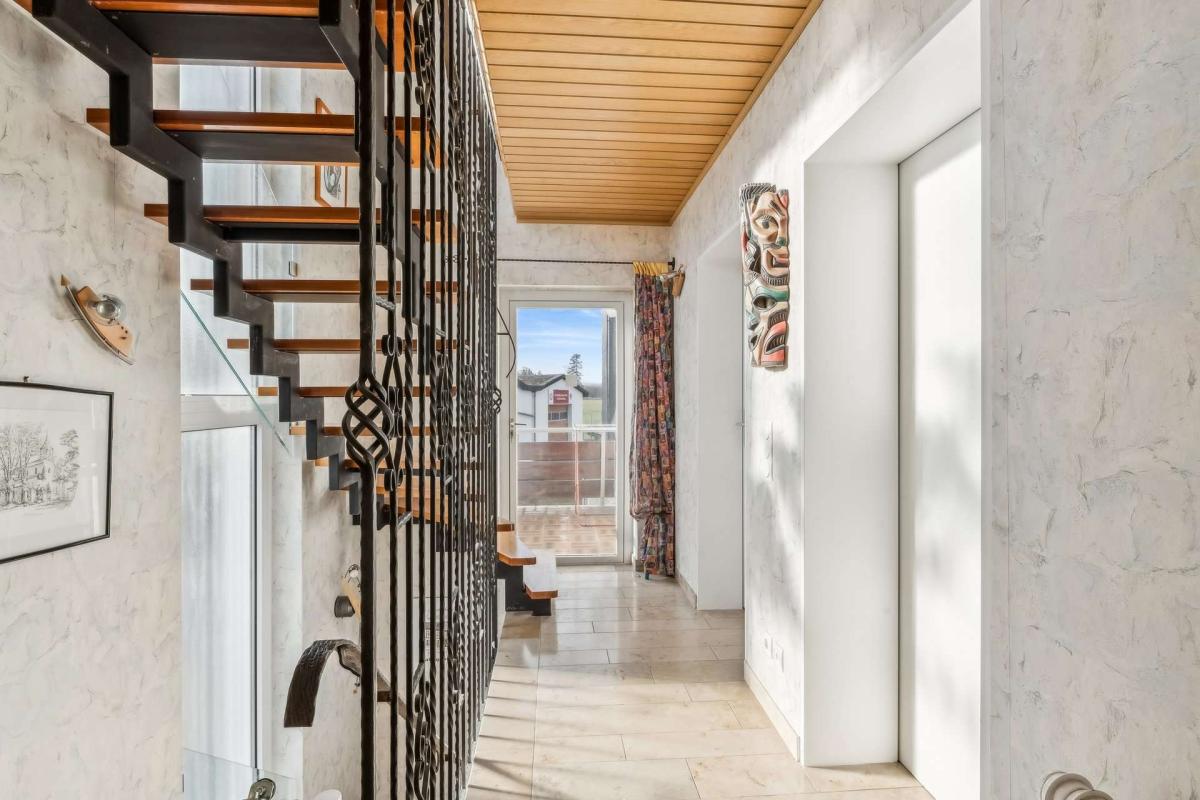 Im Obergeschoss erwartet Sie ein Bad mit zwei Waschbecken, WC, Dusche, Bidet und Badewanne, zwei separate Zimmer, davon eines mit Balkon. Ein weiterer Balkon ist vom Treppenhaus erreichbar.