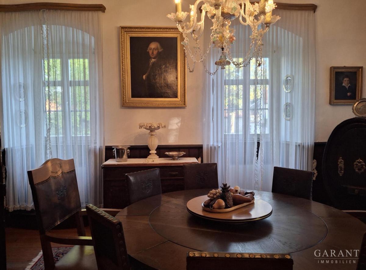 Dieses Adelspalais, klassifiziert als traufständiger Walmdachbau mit Eckquadern, ist flankiert von weiteren großen teilweise auch bewohnbaren Nebengebäuden; darunter geräumige Garagen und ehemalige Stallungen. Zwischen den Gebäuden bilden alte Bäume und verwunschenen Wege den romantischen Gartenbereich.