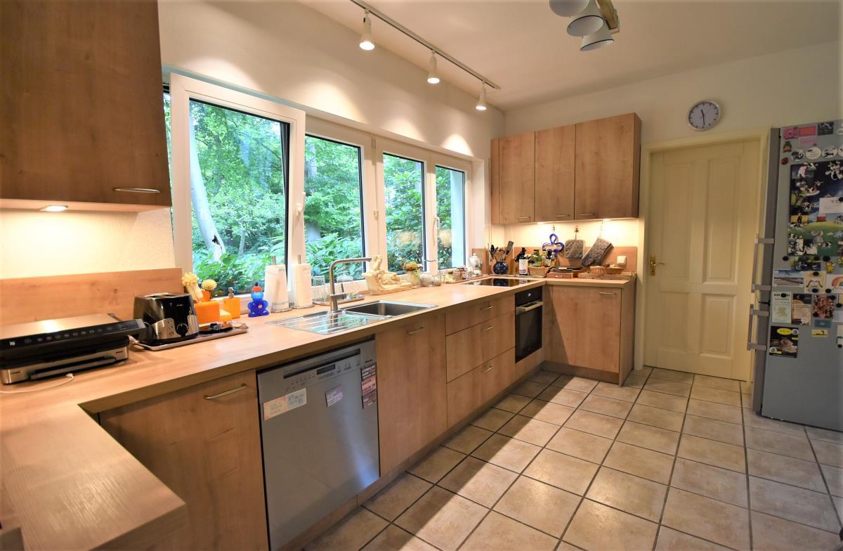 Die separate, voll ausgestattete Küche bietet nicht nur ausreichend Platz für kulinarische Entfaltung, sondern auch einen direkten Zugang zum angrenzenden, stilvollen Esszimmer. Hier sorgen integrierte Einbauschränke für praktischen Stauraum und unterstreichen das edle Ambiente. Vom Esszimmer gelangt man direkt in den beeindruckend großen Wohnzimmerbereich, der mit seinen großen Fensterfronten eine atemberaubende Verbindung zum parkähnlichen Garten schafft – ein wahrer Rückzugsort, der sowohl im Sommer als auch im Winter eine besondere Ruhe ausstrahlt.