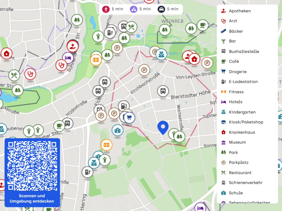 Die Immobilie in Wiesbaden-Bierstadt befindet sich in einer außergewöhnlichen Lage, die sowohl Ruhe als auch urbane Annehmlichkeiten bietet. Diese exklusive Wohngegend ist bekannt für ihre noble und ruhige Atmosphäre, die perfekt für anspruchsvolle Käufer ist, die Wert auf Privatsphäre und Eleganz legen.