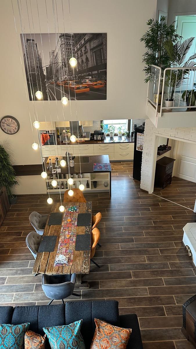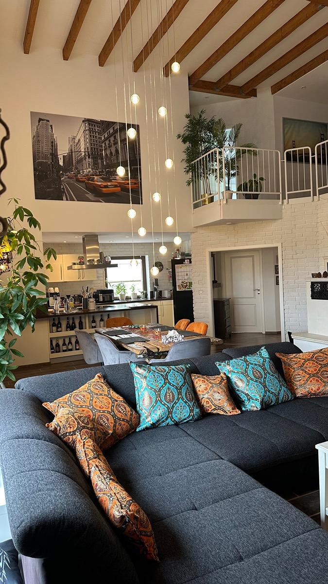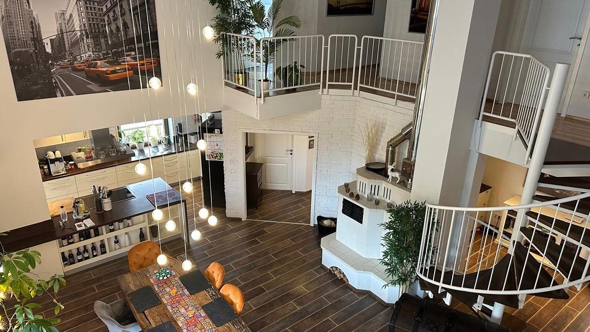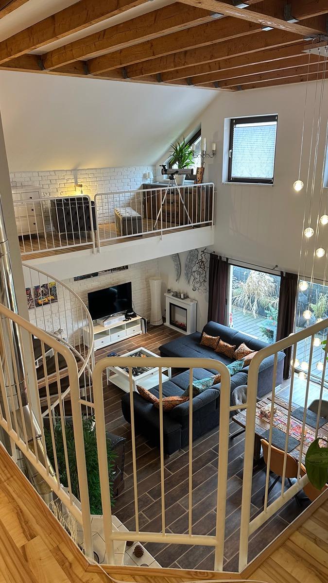 Besonders beeindruckend ist das großzügige, über zwei Etagen offene Wohnzimmer mit offener Küche, großer Galerie und einer imposanten Wendeltreppe. Ein traditioneller Kachelofen sorgt in den Wintermonaten für wohlige Wärme im gesamten Haus. Sehr geringe Heizkosten (1800 € jährlich für Heizung und Warmwasser) aufgrund sehr guter Isolierung und moderner Heizungsanlage (trotz des zentralen hohen Raums) .Haus ist Energieklasse C. ACHTUNG: Monatlich über 300 € STEUERFREIE Erträge durch die Solaranlage