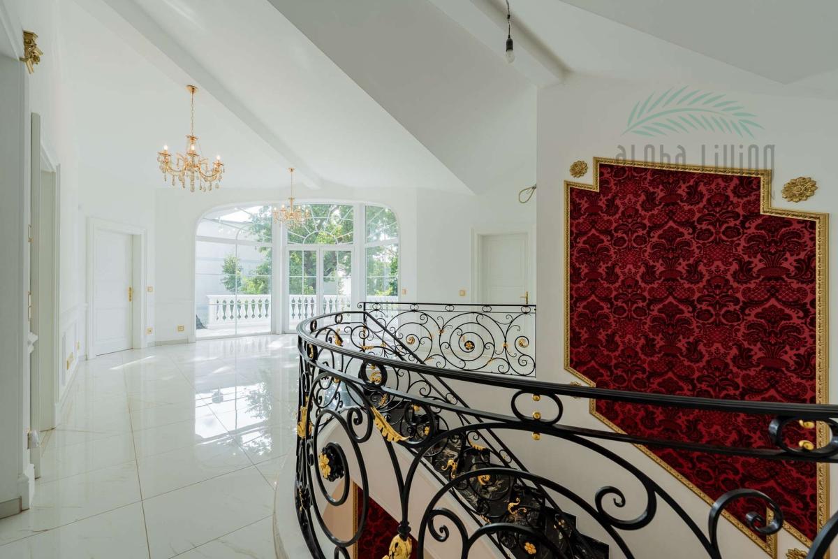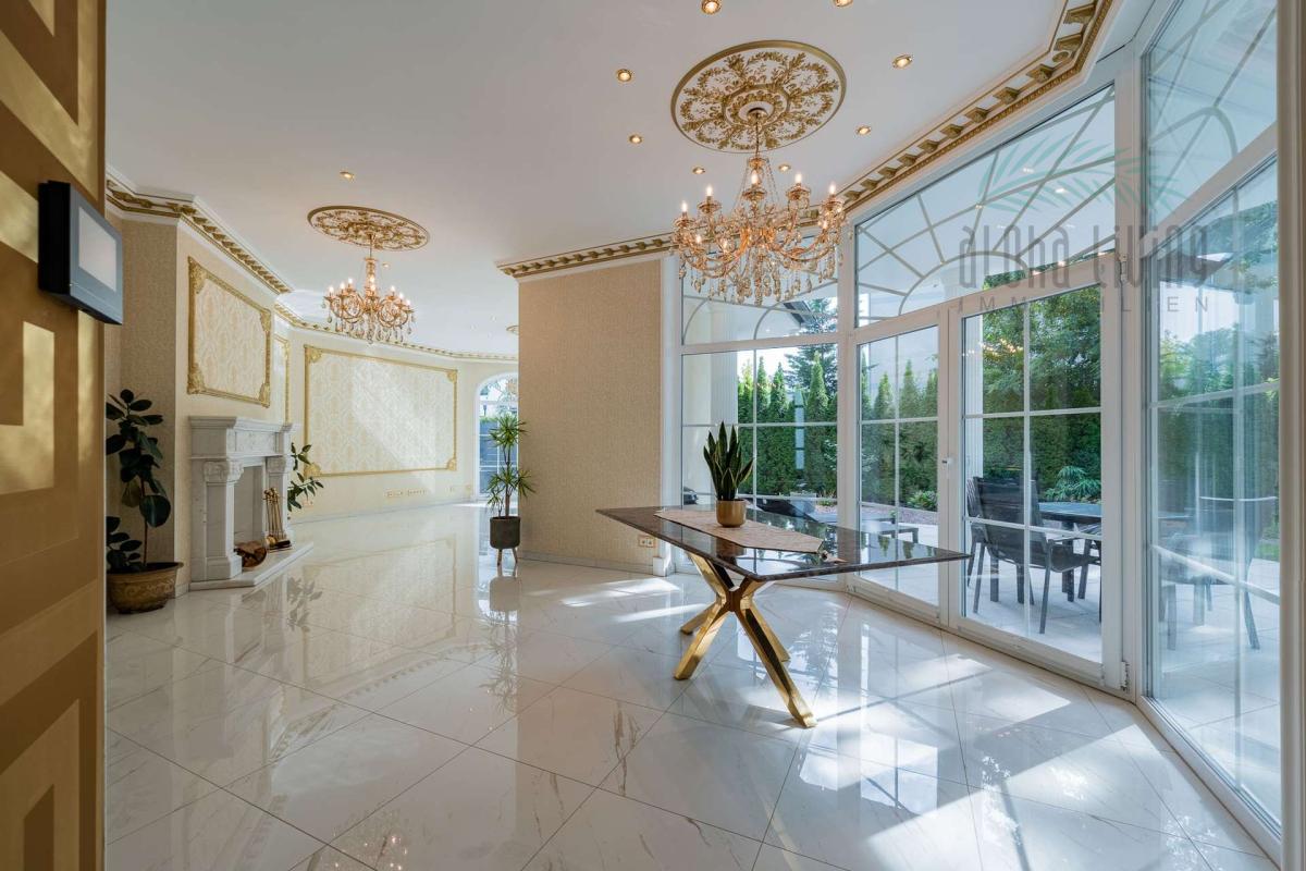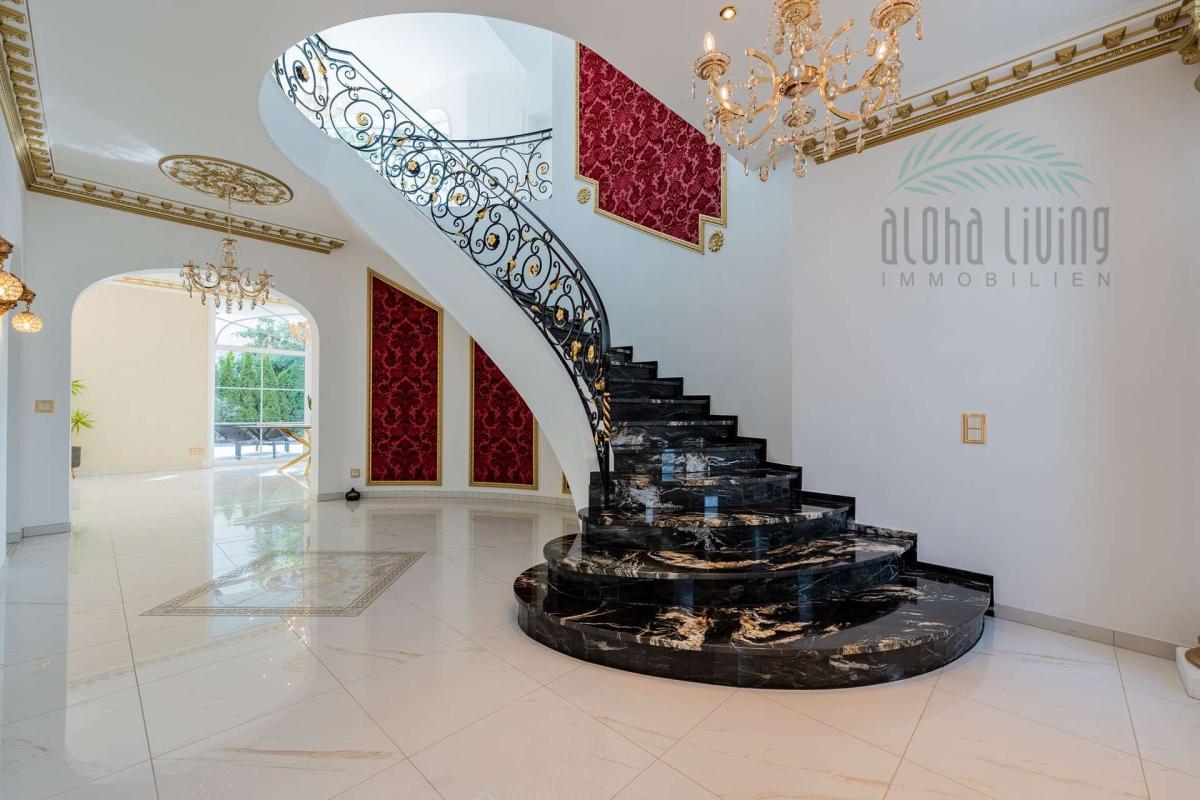 Schon beim ersten Blick auf das Anwesen beginnt die Verwandlung. Du steigst aus deinem Oldtimer, der sanft auf den gepflasterten Hof rollt. Vor dir ragen Säulen in den Himmel, gekrönt von goldenen Kapitellen – wie der Eingang zu einem Palast, der deine Geschichte weitererzählt. Die Fassade strahlt zeitlose Eleganz aus und die Flügeltür vor dir öffnet den Blick in dein neues Leben. Du gehst weiter, fast lautlos – harmonisch und kraftvoll. Das goldverzierte Geländer an der Treppe glänzt im Sonnenlicht. Alles hier fühlt sich bedeutend an – weil es das auch ist. Beim Eintreten öffnet sich ein Raum, der mehr ist als nur ein Eingangsbereich. Es ist ein Übergang von der Welt draußen in deine persönliche Sphäre. Versace-Fliesen unter deinen Füßen spiegeln das Licht, während hohe Decken ein Gefühl von Weite schenken. Von hier aus hast du Zugang zu allen Bereichen des Hauses und deines Herzens...