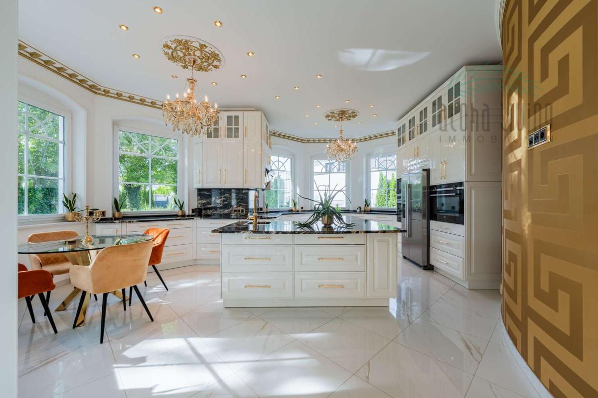 Diese außergewöhnliche Villa in Groß Glienicke ist weit mehr als nur eine Villa – sie ist ein architektonisches Statement, das Luxus, Ästhetik und Exklusivität in vollendeter Form vereint. Auf rund 282  m² Wohnfläche wartet eine Welt, die wie aus 1001 Nacht zu stammen scheint. Die aufwendige Ausstattung – darunter die hochwertigen Versace-Fliesen in sämtlichen Räumen und eine Treppe aus Belvedere-Granit aus Angola, das Geländer vor Ort handgeschmiedet und mit Blattgold veredelt – ist Ausdruck eines kompromisslosen Qualitätsanspruchs. Umgeben von ruhiger sowie exklusiver Nachbarschaft, eingebettet in ein gepflegtes als auch exklusives Wohnumfeld, bietet diese Villa eine einmalige Verbindung aus Rückzug und Repräsentation. Lass dich entführen auf eine Reise. Eine Reise in eine Villa die nicht nur deinen Wert kennt sondern ihn in die Welt hinausschreit. Bist du bereit?