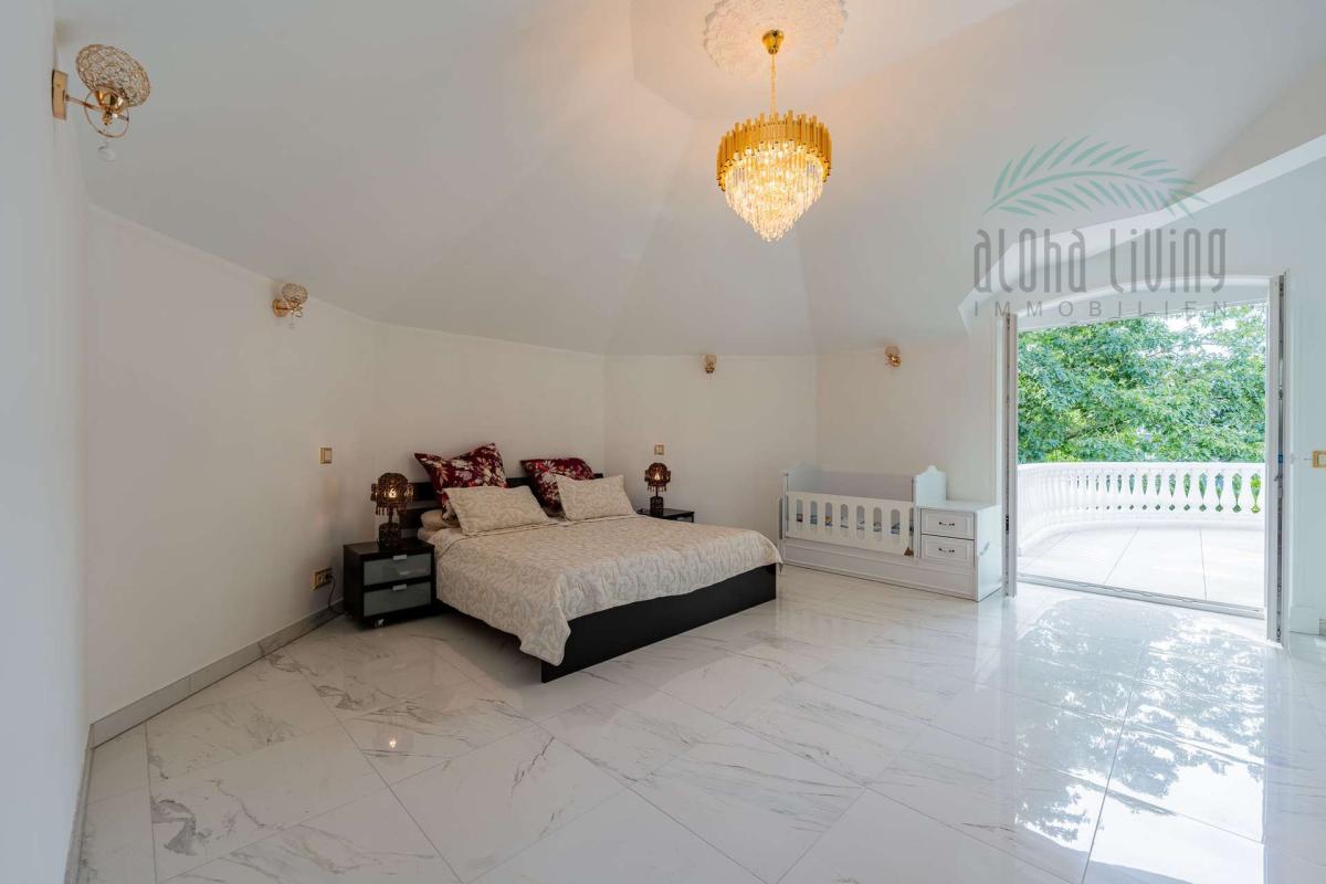 - vier Schlafzimmer bieten dir Rückzugsorte mit Persönlichkeit ob für die Familie oder Gäste – jedes Schlafzimmer ist individuell inszeniert, z.B. mit Balkonzugang, begehbarem Kleiderschrank und achteckigem Gewölbe samt Sternenhimmel