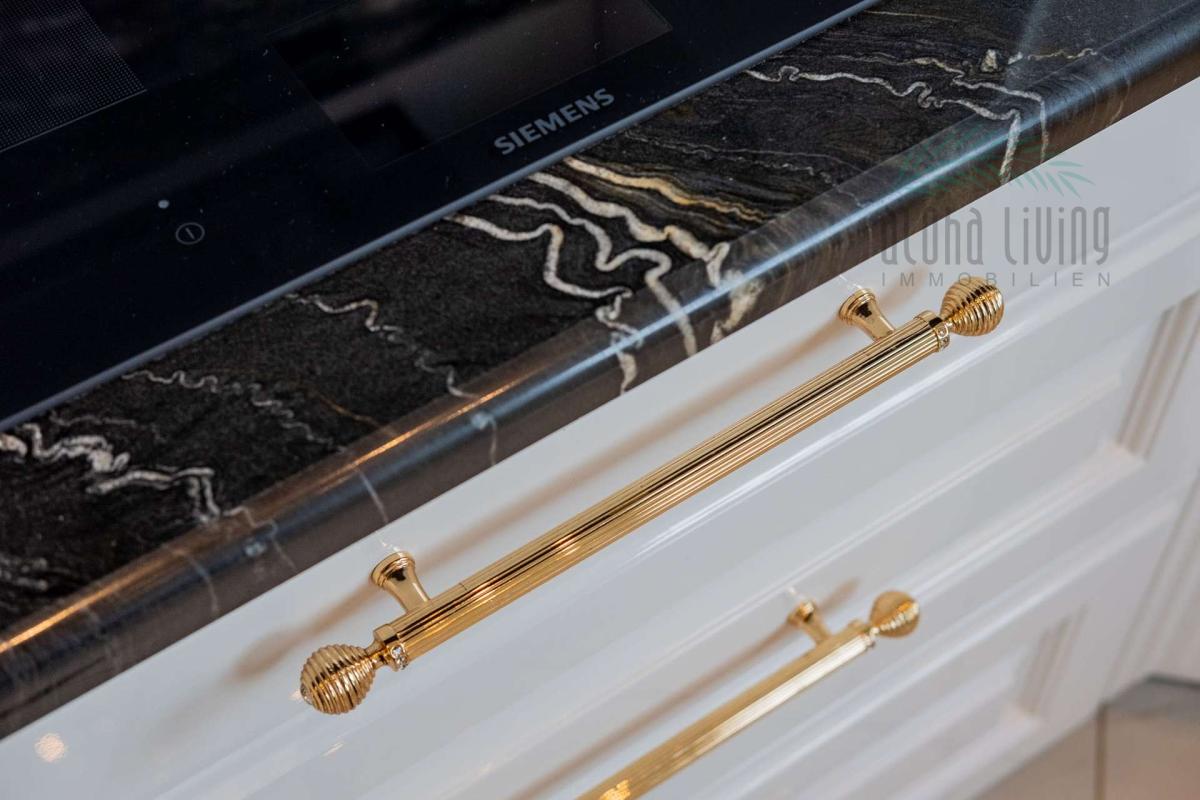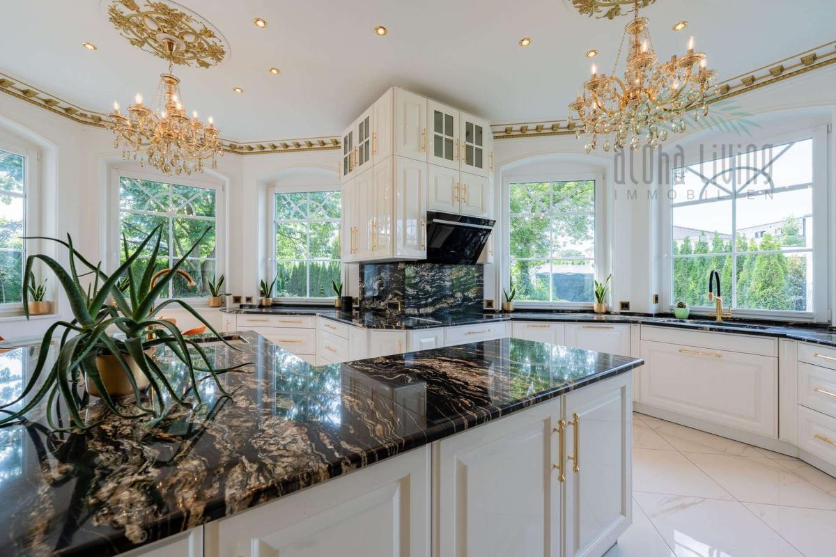 - Qualität in spürbarer Perfektion - hier wurde nichts dem Zufall überlassen, sondern echter Handwerkskunst und akribischer Materialauswahl: brasilianischer Tropical-Storm- & Belvedere-Naturstein aus Angola, handgefertigte Kronleuchter, vergoldete Kapitellen auf den Spitzen der Säulen eines Potsdamer Stuckateurs, u.v.m.