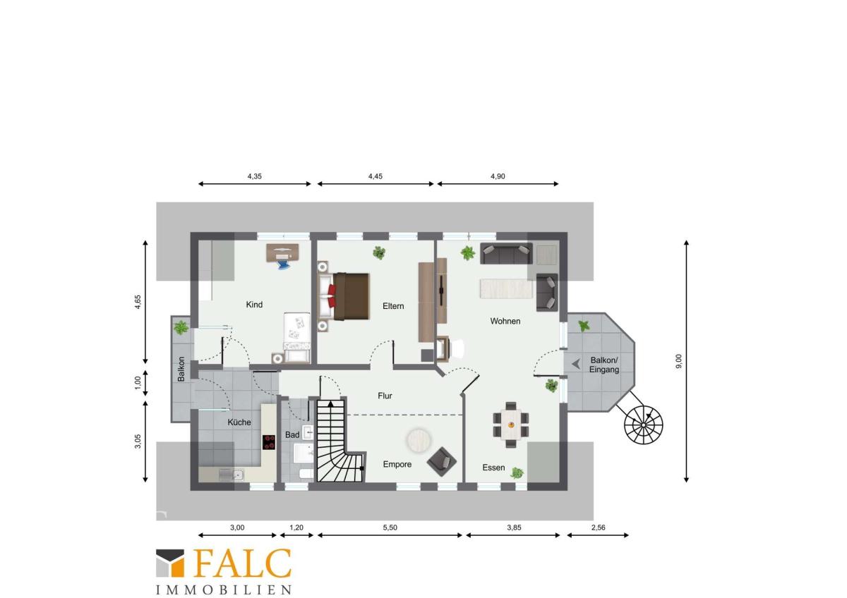 Zum Raumprogramm der Einliegerwohnung gehören zwei Schlafzimmer, eine Küche mit Balkon, ein Duschbad sowie eine Empore. Das Highlight der Wohnung ist das ca. 35 m² große Wohn- und Esszimmer. Hier befindet sich ebenfalls ein Kaminanschluss.