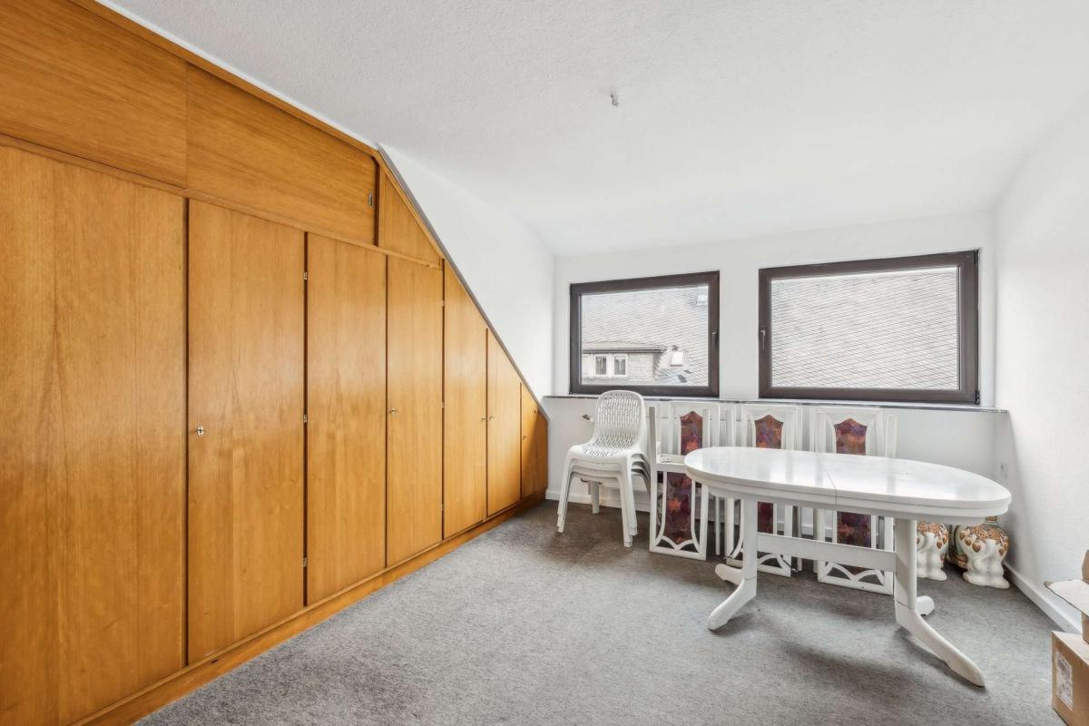 Auf dem hinteren Grundstücksteil befindet sich ein weiteres, eigenständiges Wohnhaus mit ca. 110 m² Wohnfläche, das ursprünglich um 1750 errichtet und etwa 1945 erweitert wurde. Dieses bietet zusätzliches Entwicklungspotenzial. Aktuell ist das Gebäude noch vermietet, wird voraussichtlich jedoch ebenfalls geräumt übergeben. Es umfasst ein kleines Apartment sowie eine größere Wohneinheit in den oberen Etagen. Genehmigungsrechtlich ist das Haus als Einfamilienhaus eingestuft. Im Erdgeschoss stehen darüber hinaus umfangreiche Nutzflächen zur Verfügung.