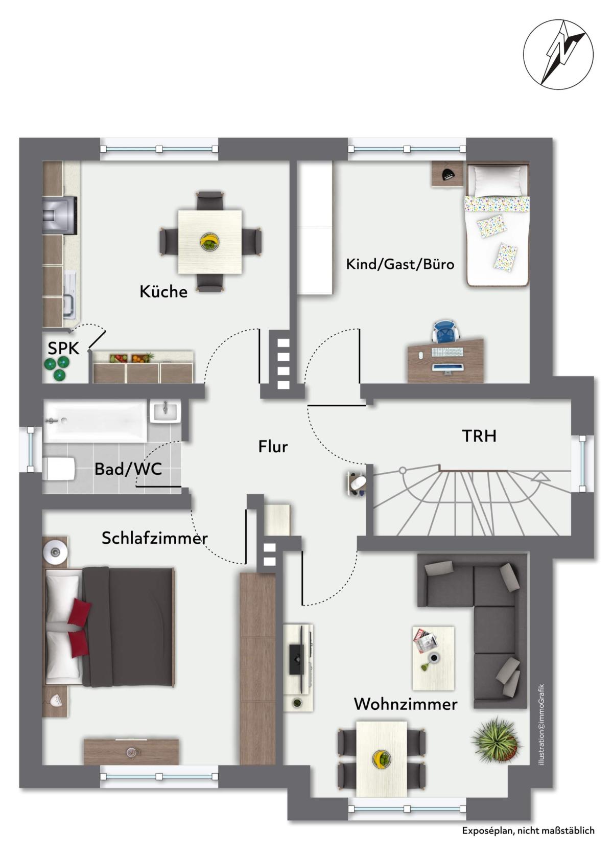 Das Gebäude ist voll unterkellert und erstreckt sich über drei Geschosse, wodurch jede Wohnung ein eigenes Geschoss mit 3 bzw. 2 ZKB umfasst. Die durchdachten Grundrisse ermöglichen eine flexible Nutzung der Wohnungen für Singles, Paare, kleine Familien oder auch ideal für Wohngemeinschaften.