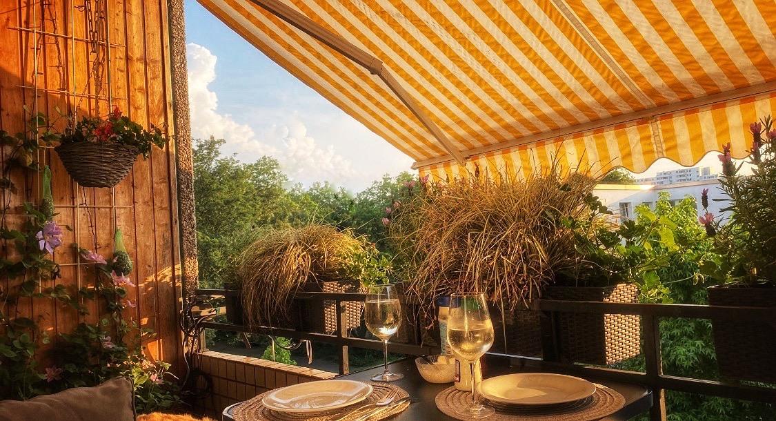 Eine hochwertige Markise ist bereits installiert und gehört zum Verkaufsumfang – für entspannte Stunden im Schatten.