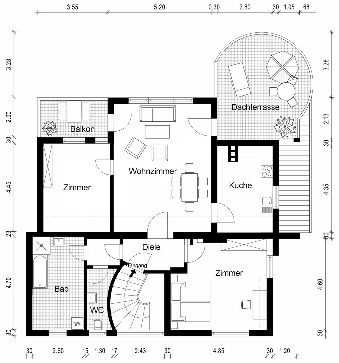 Mittelpunkt ist das attraktive Wohnzimmer mit großer Fensterfront in Richtung Süden sowie mit Balkon und einer großen Dachterrasse.
