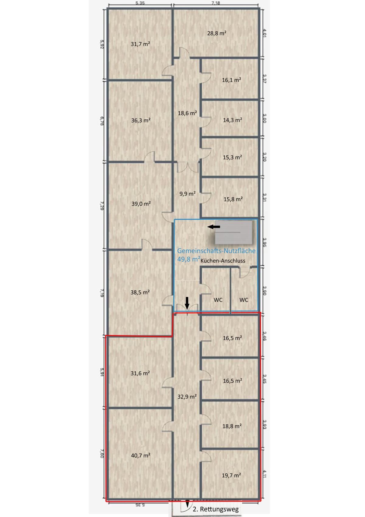 Insgesamt verfügt die geteilte Fläche über 6 Räume, die vielfältige Nutzungsmöglichkeiten bieten.