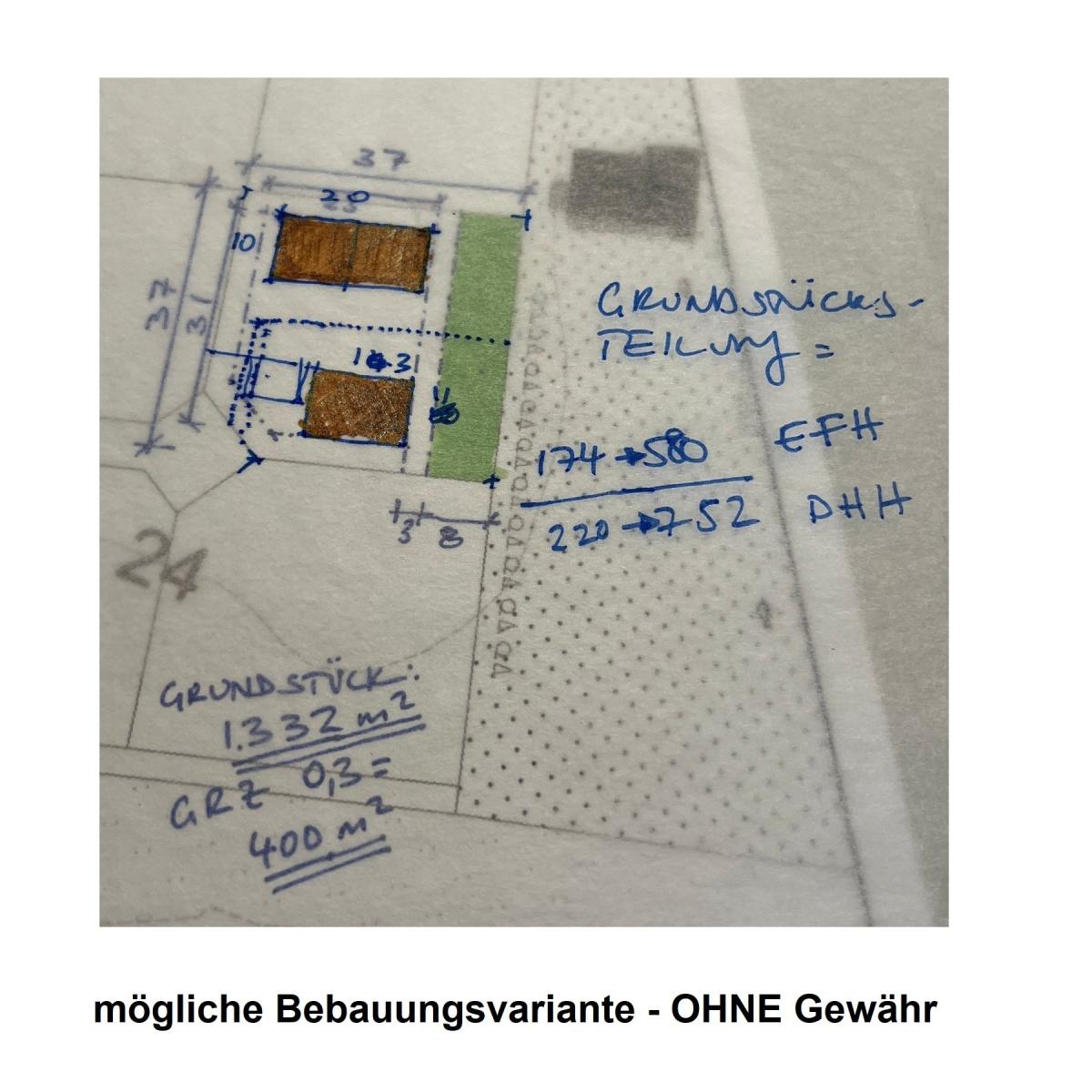 Lt. Skizzen und Bauvorschlägen seitens eines Architekturbüros ist sogar neben einem Einfamilienhaus auch ein weiteres Gebäude in Form eines weiteren Einfamilienhauses oder Doppelhauses denkbar!